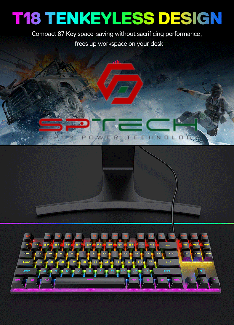 Thiết kế tiết kiệm không gian, layout full-size 87 phím T-Wolf T18 sở hữu thiết kế hiện đại, trẻ trung với tông màu đen chủ đạo, cùng hệ thống đèn LED RGB rực rỡ, tạo