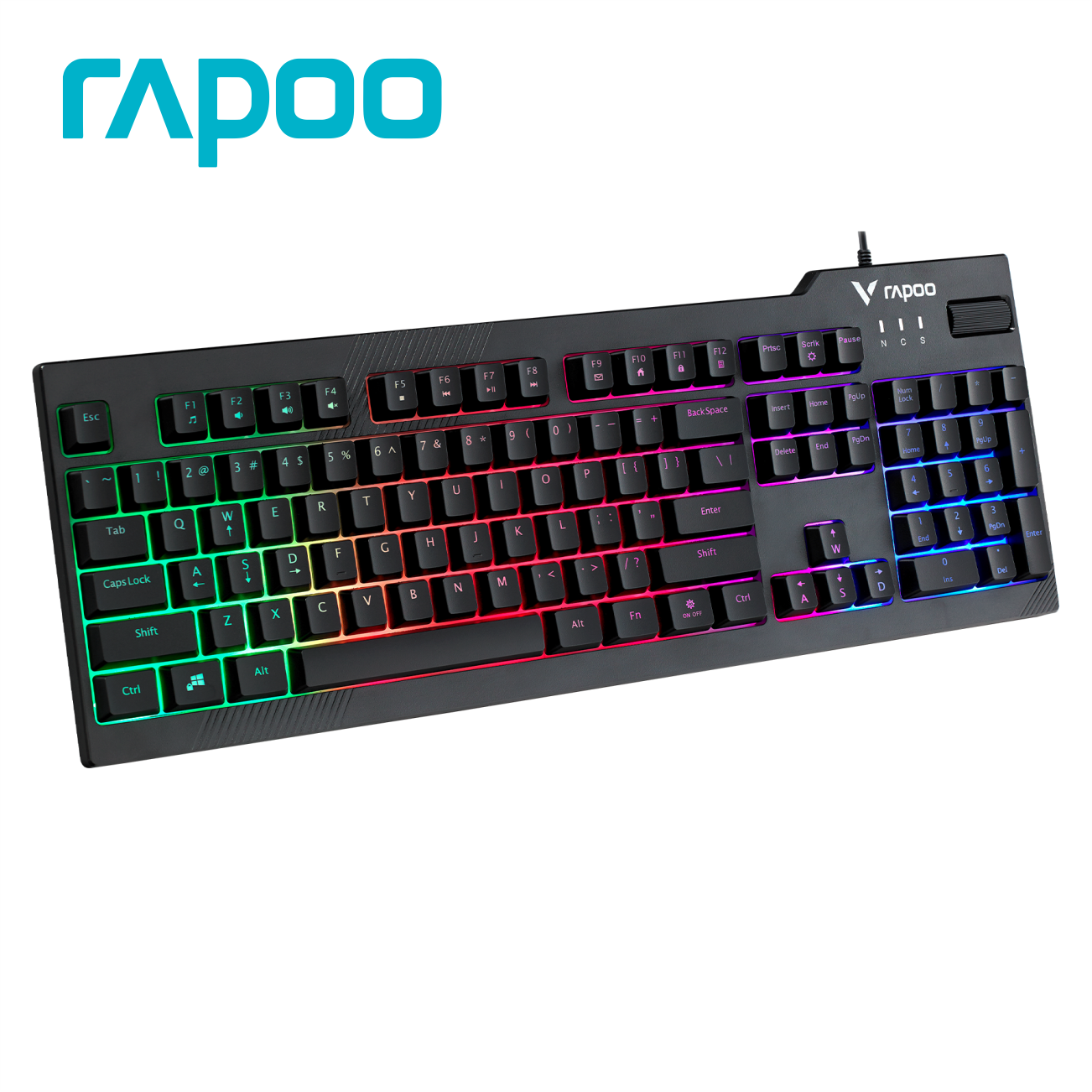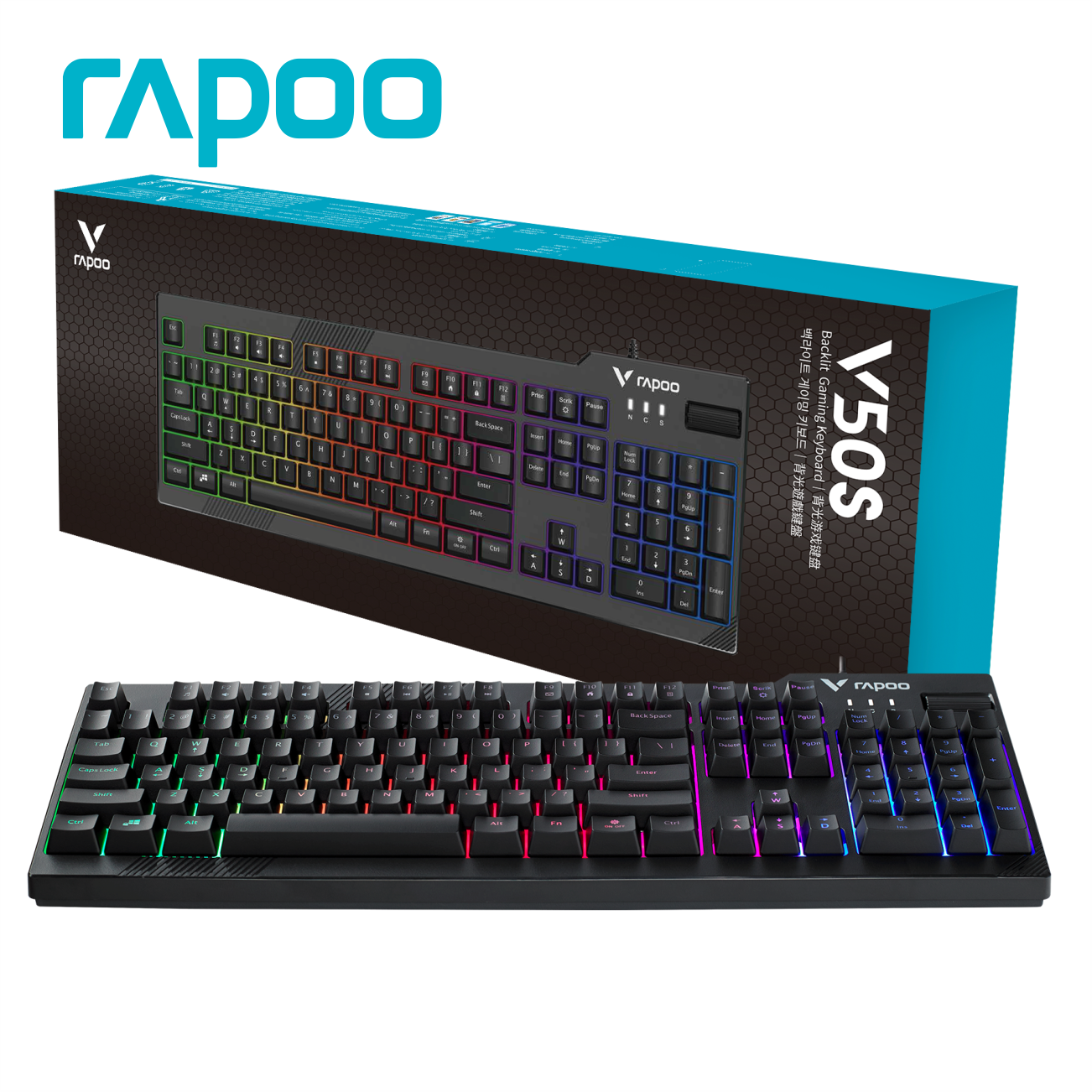 Thương hiệu: RAPOO Mã sản phẩm: V50S Bàn phím Gaming Kết nối: Dây cắm (dây dài 1.45m) Đèn LED nền 7 màu Số phím: 104 phím