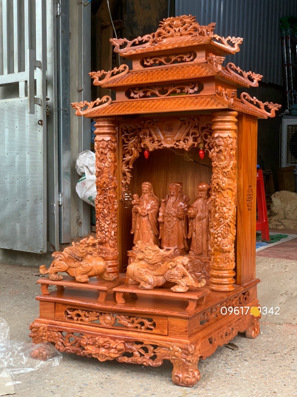 Bàn thờ ông địa thần tài bằng gỗ hương đá cực đẹp kt 61×69×130cm   Tranh thờ cửu huyền thất tổ bằng gỗ hương đỏ sơn pu dát vàng cao cấp kt 68×98×4cm