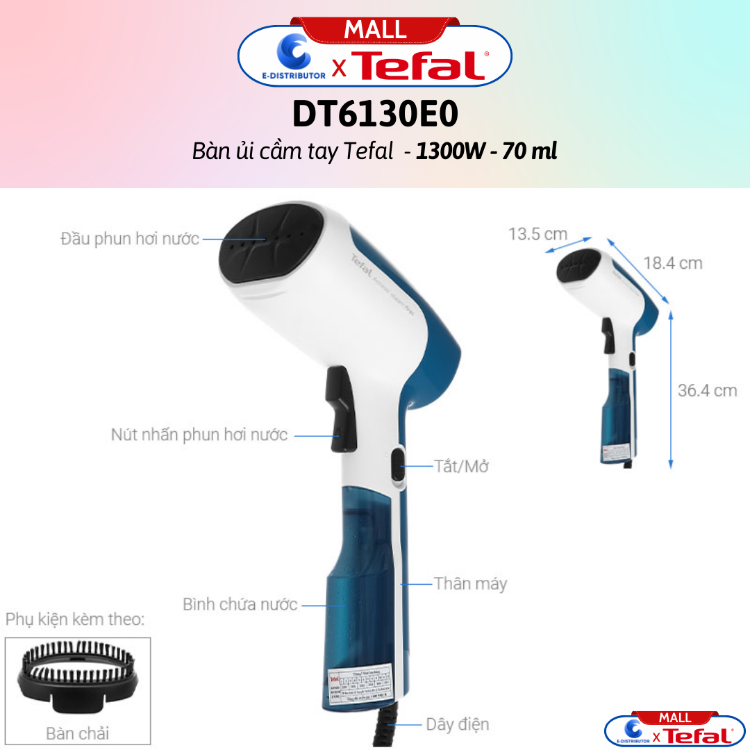 THÔNG TIN SẢN PHẨM Thông số kỹ thuật Bàn ủi cầm tay Tefal DT6130E0 1300W - Công suất 1300W - Bình nước 70 ml - Mặt đế Nhựa - Chức năng Ủi hơi nước - Tiện ích Ủi quần áo treoThiết kế nhỏ gọn, dễ mang đi du lịch - Chế độ an toàn Tự ngắt khi quá nhiệt - Kích thước - Khối lượng Ngang 13.5 cm - Cao 36.4 cm - Sâu 18.4 cm - Nặng 0.85 kg - Thương hiệu của Pháp - Hãng Tefal. Thông tin sản phẩm Bàn ủi Tefal DT6130E0 thiết kế cầm tay thông minh, kiểu dáng hiện đại nhỏ gọn với gam màu sắc trẻ trung Công suất hoạt động tối đa lên đến 1300W giúp quần áo thẳng nhanh chóng, hiệu quả, tiết kiệm thời gian, công sức Chế độ phun hơi thẳng đứng cho phép ủi quần áo hay vải khi đang treo, tiện lợi khi cần ủi rèm cửa, tiết kiệm công sức và thời gian Hơi phun cường độ cao 20 g/phút, làm khô nhanh chóng. Xem thêm: Cách sử dụng bàn ủi hơi nước đúng cách, an toàn Đầu bàn ủi bằng nhựa chịu nhiệt, bền chắc, an toàn khi sử dụng Bàn ủi có dung tích bình chứa nước 70 ml ủi được khoảng 2 áo sơ mi Xem thêm: Cách châm nước vào bàn ủi hơi nước An tâm sử dụng với chức năng ngắt điện tự động Bàn ủi hơi nước cầm tay sẽ tự động ngắt điện khi quá nhiệt hoặc nếu không được sử dụng trong khoảng thời gian nhất định, giúp tăng độ bền cho máy, đảm bảo an toàn cho người dùng. Đi kèm bàn chải vải hỗ trợ tối đa nhu cầu sử dụng Xem thêm: Cách vệ sinh bàn ủi hơi nước đúng cách. Bàn ủi cầm tay Tefal DT6130E0 ủi thẳng mọi quần áo dễ dàng, nhanh chóng, tiện sử dụng, giá tốt, đáp ứng nhu cầu của người nội trợ bận rộn.