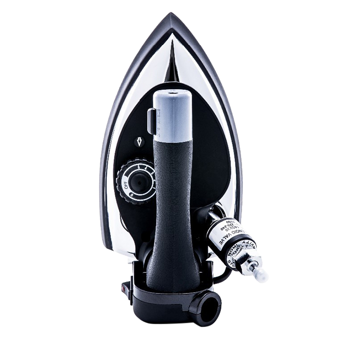 Tay cầm bàn ủi dài, với thiết kế gợn sóng cho việc cầm nắm khi ủi dễ dàng hơn, tránh bị mỏi tay khi ủi nhiều. Công tắt hơi nằm trên tay cầm, ở vị trí này người dùng dể dàng thao tác ấn hơi nước phun ra khi cần thiết.