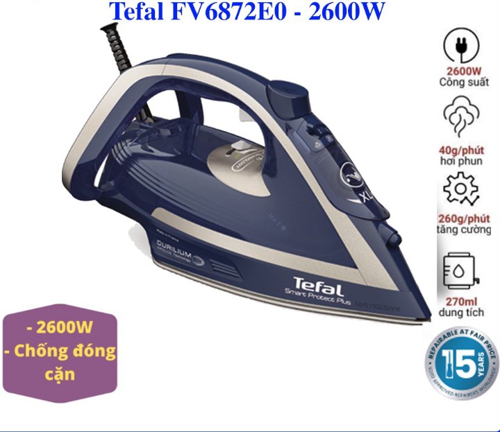 Bàn ủi hơi nước Tefal Smart Protect Plus FV6872E0 - 2800W - Hàng chính hãng - Công suất: 2800W - Hơi phun: 40g/ phút - Hơi tăng cường: 260g/ phút - Mặt đế: Durilium, lướt