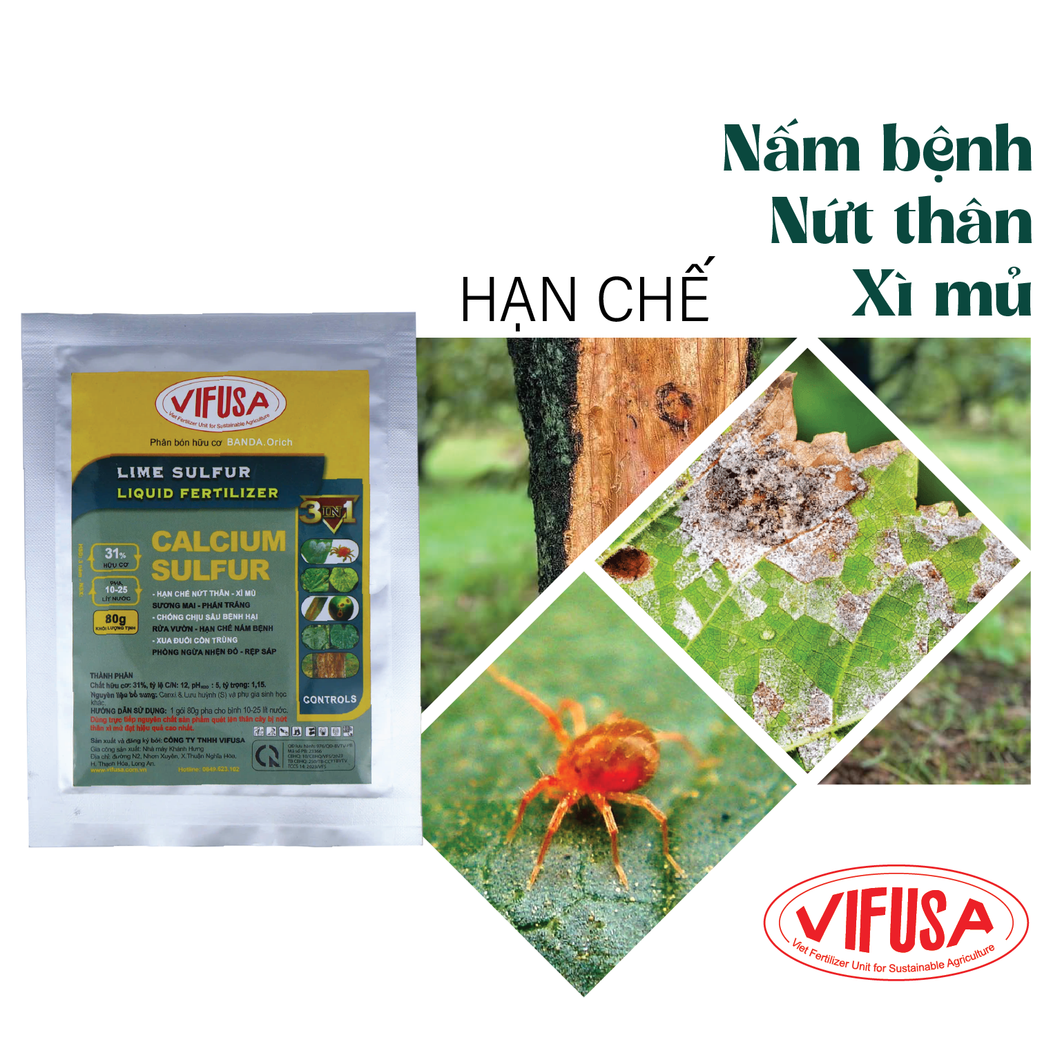 - Ngoài ra, phụ gia chứa lưu huỳnh (S) dạng Calcium Polysulfide 24% hạn chế nấm bệnh gây nứt thân xì mủ, sương mai, phấn trắng và bệnh do nhện gây ra.