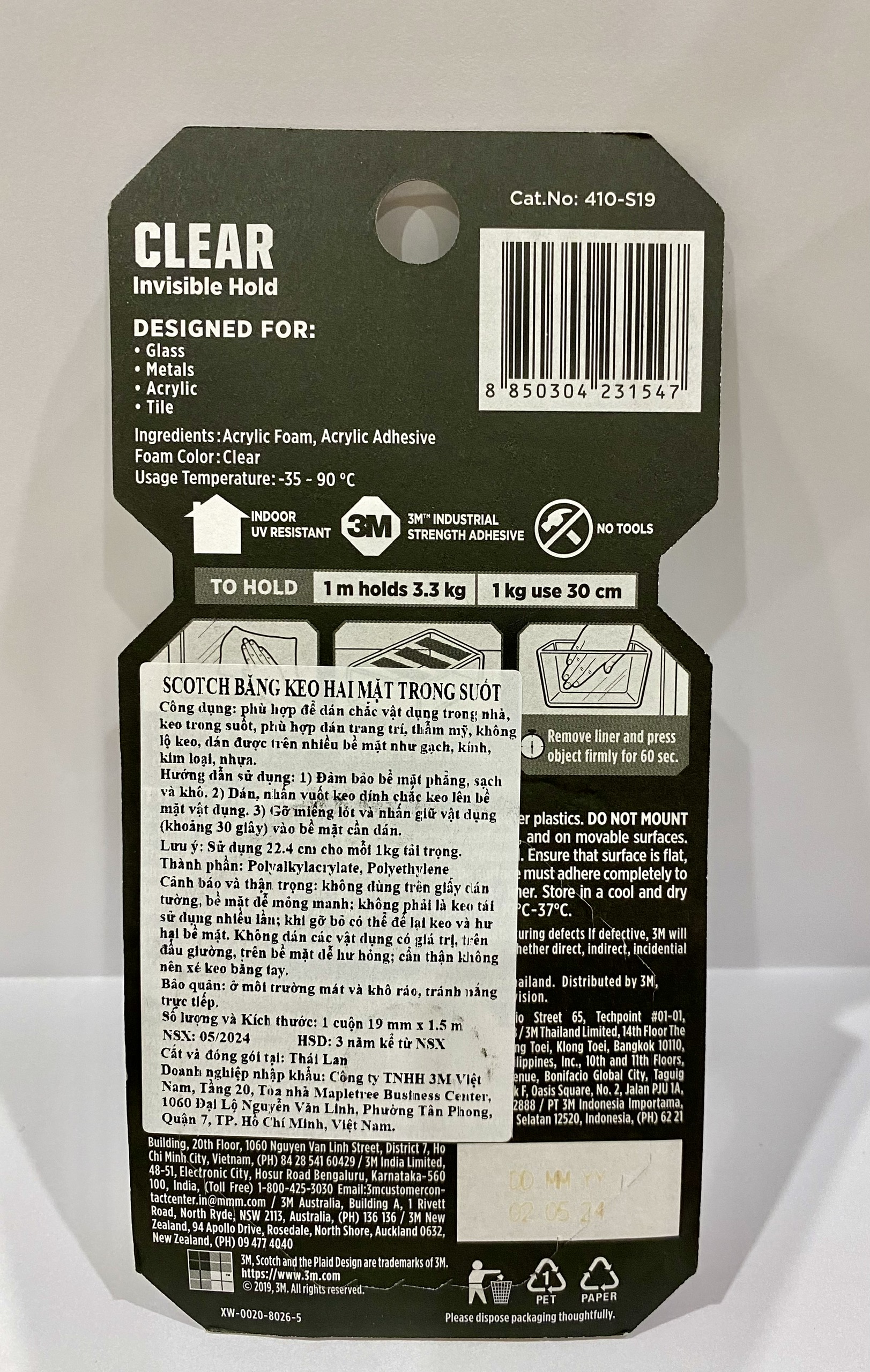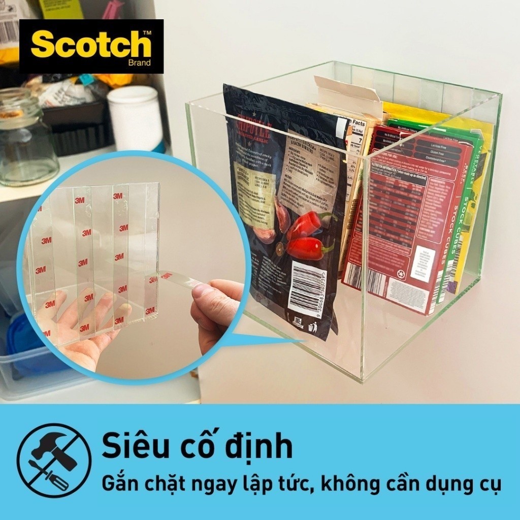 Mua tại TiktokBăng keo hai mặt trong suốt Scotch 3M 410 - M19, 19mm x 1.5m - với chất liệu nhựa Acrylic với 3 lớp màng dính siêu bền, khó nhận thấy vết dán, chính là lựa chọn lý tưởng cho mọi bề mặt Thông số kỹ thuật: Thương hiệu: 3M Xuất xứ thương hiệu: Mỹ Sản xuất tại: Thái Lan Mã sản phẩm: 410-M19 Quy cách: 1 cuộn/vỉ Kích thước: 19mm x 1.5m, 19mm x 4m Hạn sử dụng: 3 năm ĐẶC TÍNH SẢN PHẨM