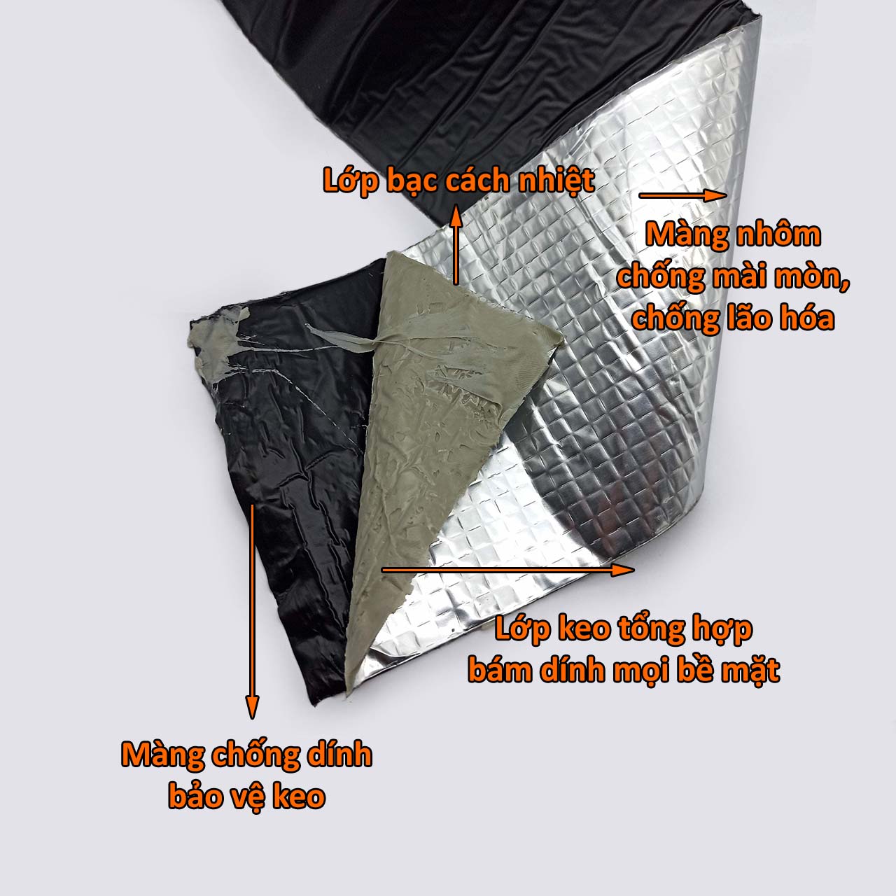 - Đầu tiên là lớp màng nhôm ngoài cùng, do tiếp xúc trực tiếp với môi trường bên ngoài nên có kết cấu cực kỳ dẻo dai,chịu được lực kéo và chống oxy hóa, ngăn tia cực tím, làm giảm quá trình phân huỷ lớp keo bên trong, chống thấm và chống mài mòn.