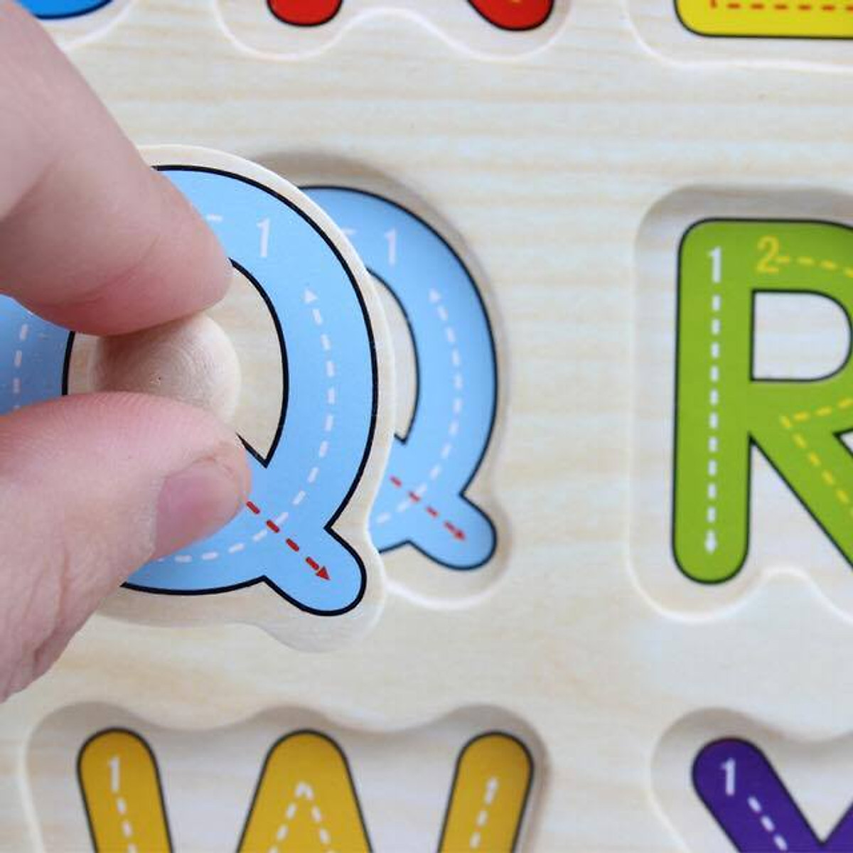 - Phía dưới mỗi miếng ghép có in hình (trừ các mẫu CHỮ IN HOA, SỖ & DẤU, SỐ 0-20 là không có hình in phía dưới) để bé dễ quan sát và ghép theo, bé sẽ ghi nhớ nhanh hơn