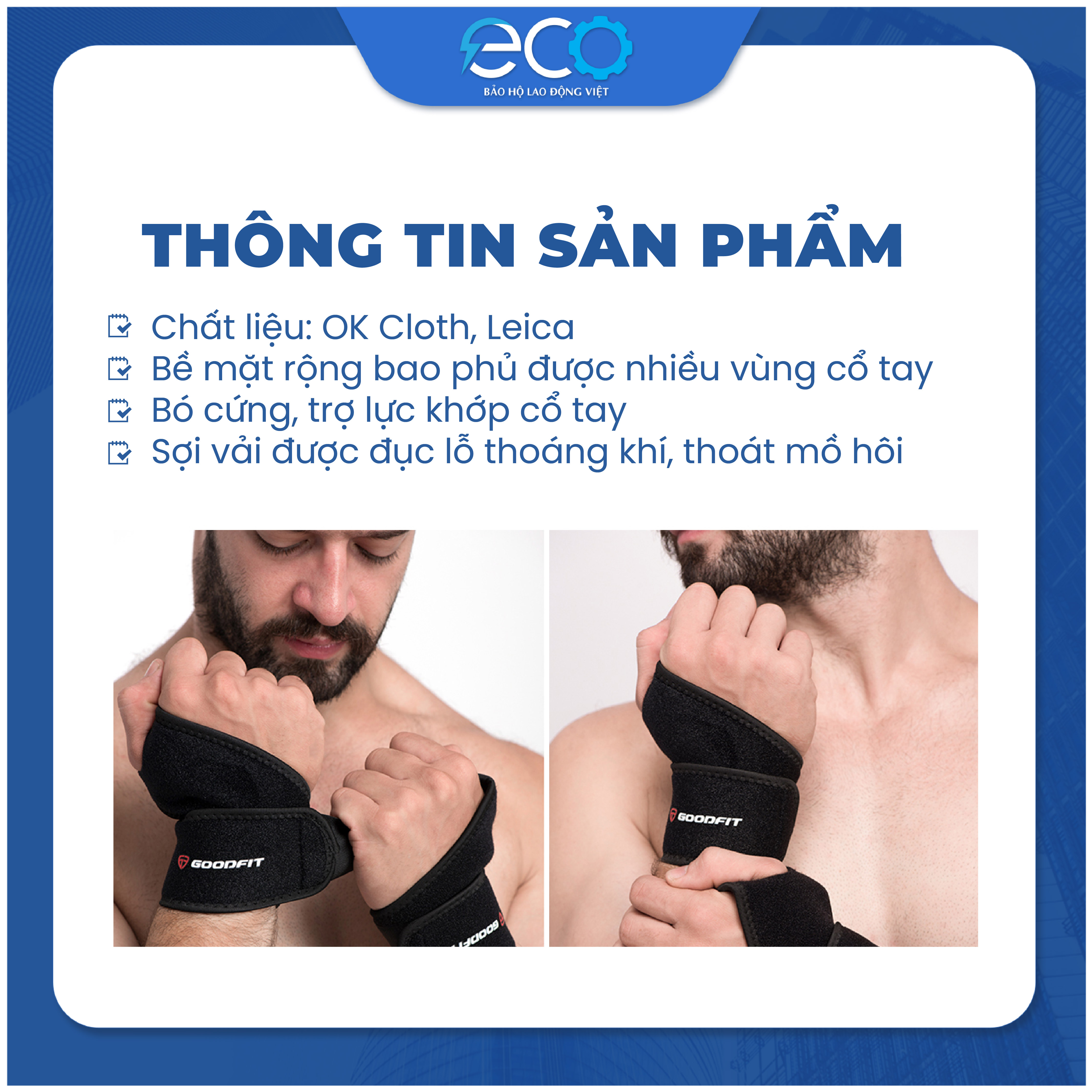 - Tập luyện với cường độ cao, việc ra mồ hôi tay là điều không thể tránh khỏi. Với những người có có bệnh về tăng tiết mồ hôi ở lòng bàn tay, còn đang quan ngại hơn nữa khi tập thể thao. Hiểu được vấn đề đó, trên mỗi sản phẩm băng cổ tay của GOODFIT đều được đục lỗ thoáng khí, thoát mồ hôi nhanh trong khi tập luyện.