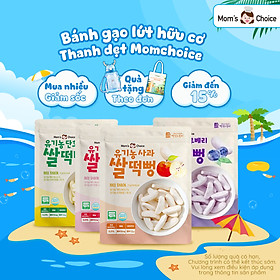 Tên sản phẩm: Bánh ăn dặm gạo lứt hữu cơ thanh dài Mom's Choice cho bé từ 6 tháng tuổi. Thương hiệu: Mom's Choice. Xuất xứ: Hàn Quốc. Gồm 3 vị: Dâu, Việt quất, Vị