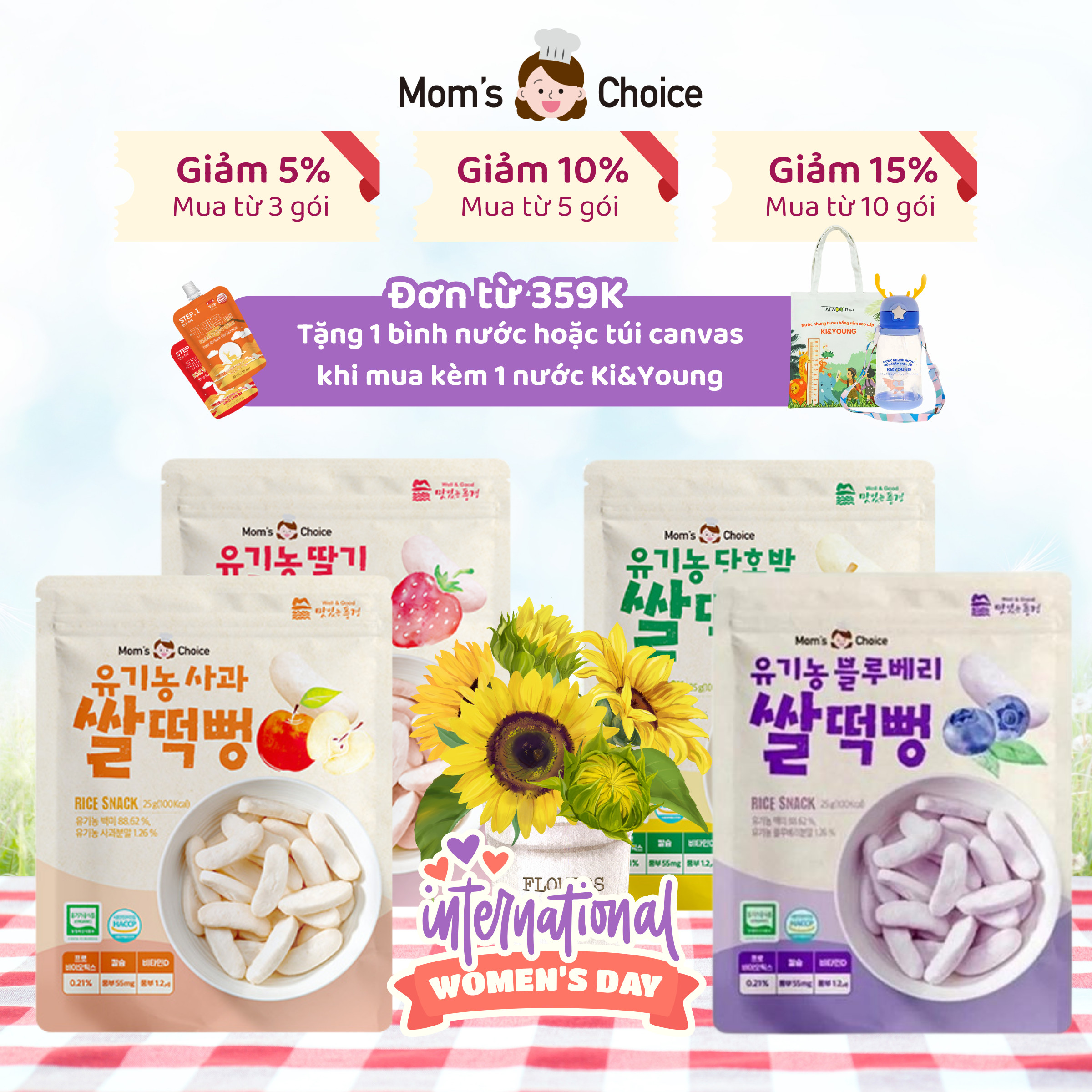 ĐỀN 10 LẦN NẾU PHÁT HIỆN HÀNG KHÔNG PHẢI HÀNG CHÍNH HÃNG. Tên sản phẩm:                Bánh ăn dặm cho bé 6 tháng từ gạo hữu cơ. Thương hiệu:                  Moms Choice. Xuất xứ:                          Hàn quốc. Gồm 4 vị:                        Dâu, Bí đỏ, Táo, Việt quất. Trọng lượng:                   25g/gói Chứng nhận:                   HACCP an toàn thực phẩm. Dành cho:                       Bé từ 6 tháng tuổi. HSD:                              12 tháng kể từ ngày sản xuất.   Bánh ăn dặm gạo hữu cơ Moms Choice do ALADDINVINA phân phối trực tiếp và bày bán tại các cửa hàng, siêu thị cho mẹ và bé như: Bibomart, Tutimart, Shoptretho, Sóc & Brothers, Con Cưng. Chương trình quà tặng đặc biệt cho các sản phẩm bánh ăn dặm. Thời gian diễn ra: 01/05/2024 - Khi hết quà tặng. SỐ LƯỢNG QUÀ TẶNG CÓ GIỚI HẠN. CHƯƠNG TRÌNH CÓ THỂ KẾT THÚC SỚM HƠN DỰ KIẾN Khi mua các sản phẩm ăn dặm có giá trị đơn hàng từ 359.000 đồng trở lên và có kèm từ 01 sản phẩm nước Nhung Hươu Ki&Young sẽ được tặng ngẫu nhiên 01 Bình nước hoặc 01 Túi canvas. Riêng sản phẩm nước Nhung hươu Ki&Young khi mua từ 10 gói sẽ được tặng ngẫu nhiên 01 Bình nước hoặc 01 Túi canvas ĐỀN 10 LẦN NẾU PHÁT HIỆN HÀNG KHÔNG PHẢI HÀNG CHÍNH HÃNG. Đặc điểm nổi bật: