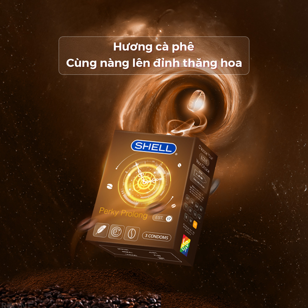 ✪ Thông tin: Shell Perky Prolong được sản xuât bằng chất liệu cao su Latex cao cấp, mang lại chất lượng tốt nhất, độ co giãn và dẻo dai cao mang lại cho bạn sự tự tin, thoải mái và yên tâm khi quan hệ. Thêm vào đó, sản phẩm có mùi hương cà phê đánh thức sực tỉnh táo cùng thiết kế siêu mỏng và kéo dài thời gian quan hệ, chắc hẳn sẽ làm hài lòng người sử dụng.