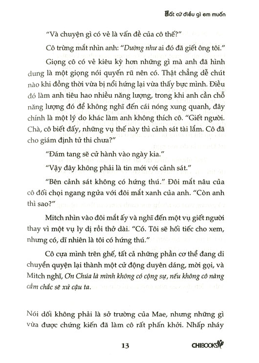 Từ đầu đến chân, Mae Sullivan thực sự bốc lửa với một thân hình chết người – và kèm theo đó là một gia đình bất hạnh. Có một điều gì đó không hoàn toàn trung thực ở cô ta, nhưng cô ta đem đến một vụ án mà anh không thể nào chối từ… và để lại trong anh một cơn khát tình mà anh chưa từng có kể từ thời trung học. Nhưng liệu có phải Mae chỉ quan tâm đến việc bắt được kẻ lừa đảo phản bội đã giết ông của mình… hay quý cô đó muốn bắt chính con người anh?