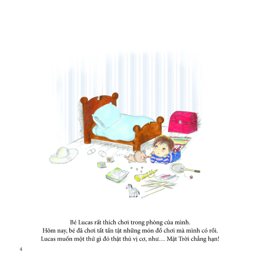 Hôm nay, Lucas đã chơi tất tần tật những món đồ chơi mà mình có rồi. Bé muốn một thứ gì đó thật thú vị cơ, như… Mặt Trời chẳng hạn! Nhưng làm sao mà chơi với Mặt Trời được nhỉ?