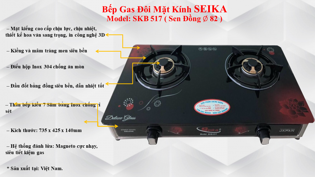 - Bếp Gas Đôi Mặt Kính Sen Đồng Seika SKB517 - Hàng Chính Hãng có thiết kế nhỏ gọn, dễ dàng phù hợp với nhiều không gian bếp, ngoài ra với bề mặt kính luôn