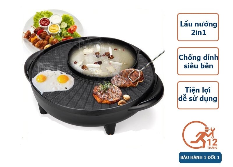 Mỗi dịp gia đình có việc hay liên hoan bạn bè “tại gia”, thay vì phải lỉnh kỉnh cả nồi lẩu và bếp nướng, mất thời gian, tốn diện tích, bạn hoàn toàn có thể vừa ăn lẩu, vừa ăn nướng chỉ với 1 chiếc nồi. Chúng tôi xin giới thiệu nồi lẩu nướng 2 trong 1 BBQ mẫu mới, hiện đại hơn .     Nồi lẩu nướng BBQ là sản phẩm Bếp nướng điện kết hợp với Chảo lẩu điện tạo nên một sản phẩm vượt trội so với những sản phẩm cùng loại đã có trên thị trường bởi nhiều ưu điểm và tính năng an toàn. Với sản phẩm này, bạn có thể vừa nướng nhiều loại thức ăn và nấu lẩu cùng lúc thật dễ dàng.         Sản phẩm là sự kết hợp hoàn hảo giữa bếp nướng và bếp lẩu có mặt trên thị trường. Với Bếp lẩu nướng đa năng, người sử dụng có thể vừa nướng nhiều loại thức ăn và đồng thời nấu lẩu cùng một lúc. Với thiết kế 2 trong 1 này bạn hoàn toàn không mất nhiều thời gian, công sức đi lại mà vẫn có những món thịt nướng thơm lừng, không khói bụi, hay những món lẩu ưa thích bên gia đình.