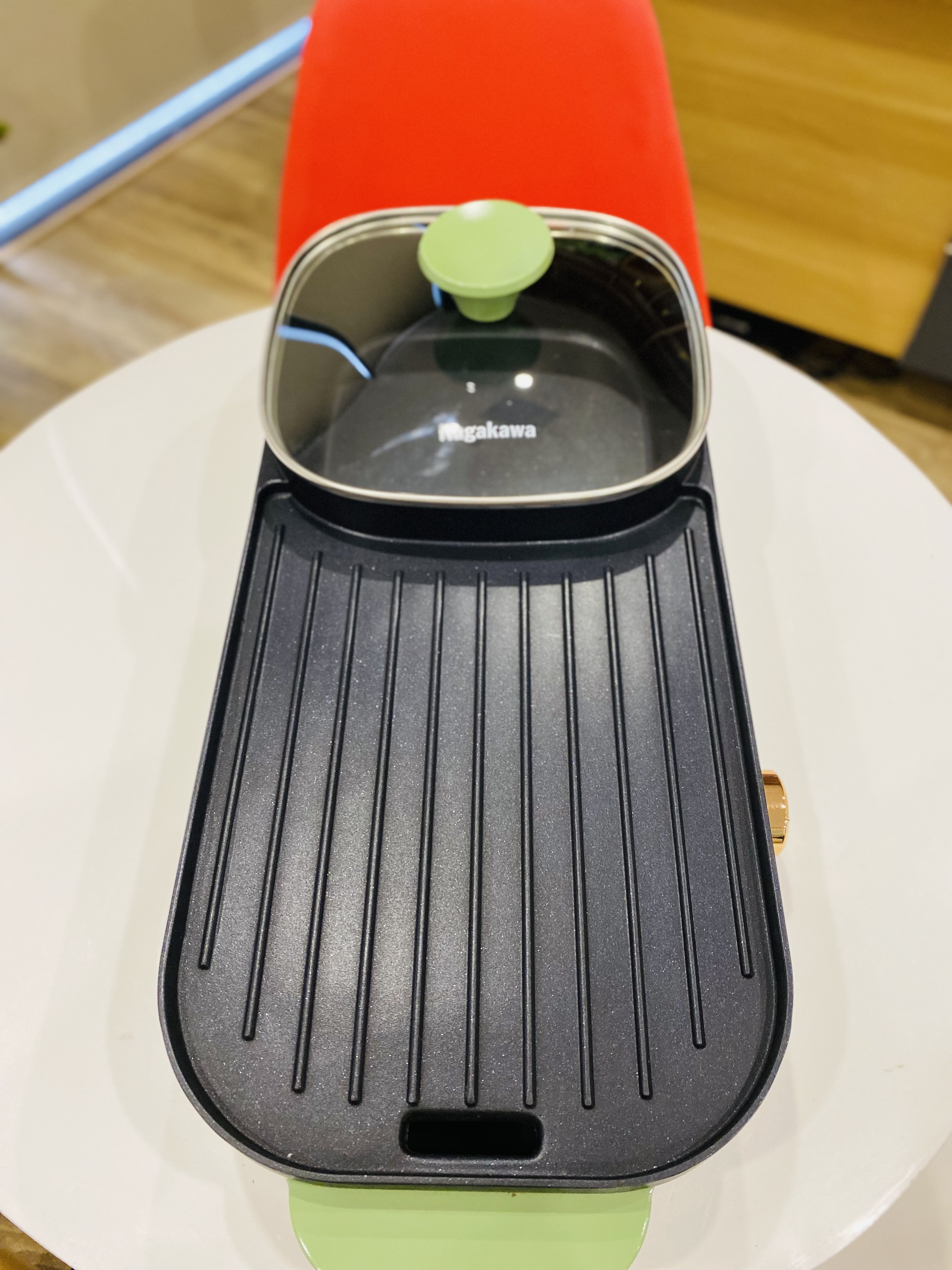 THỐNG SỐ KĨ THUẬT Công suất 1800W Điện áp 220VAC Chất liệu Nhôm phun sơn chống dính Kích thước sản phẩm 565x320x80mm Trọng lượng sản phẩm 2.2 kg Nồi đa năng 2 trong 1: Nướng
