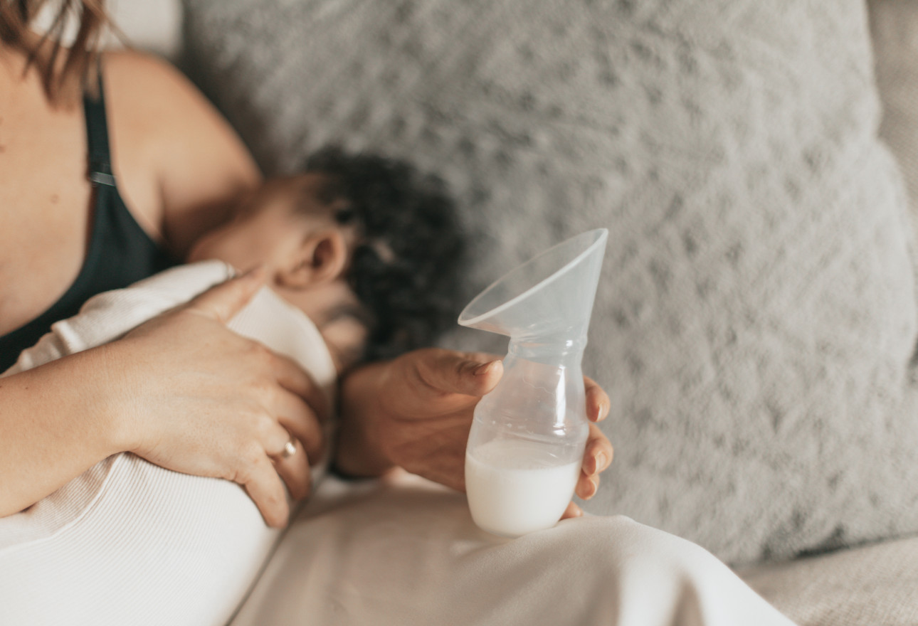 - Cố định dụng cụ hứng sữa trên bầu ngực mẹ, đảm bảo ti mẹ giữa cổ bình
