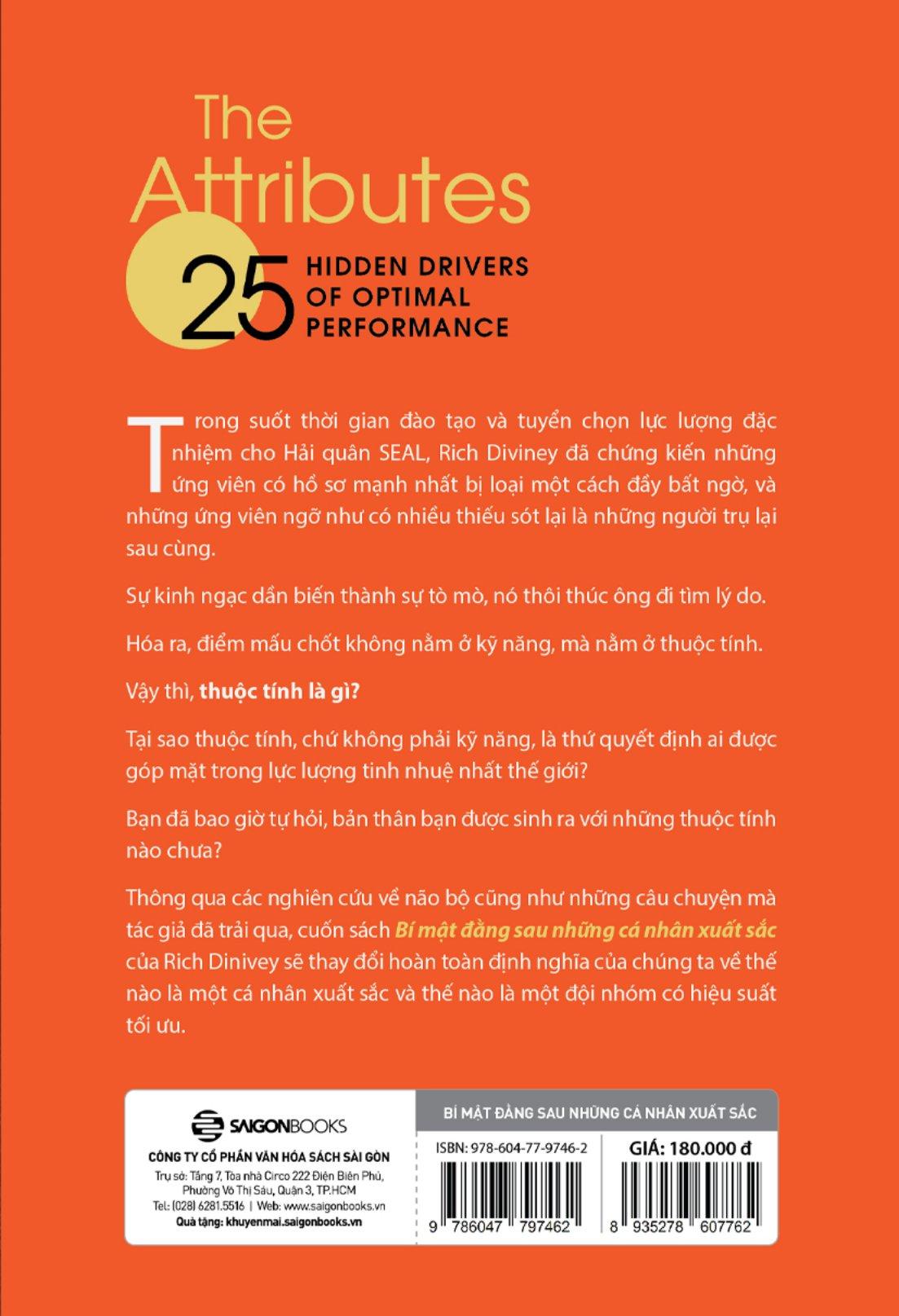 Bí Mật Đằng Sau Những Cá Nhân Xuất Sắc Điều gì sẽ giúp bạn đưa ra quyết định đúng đắn khi rơi nghịch cảnh? Theo tác giả Rich Diviney viết trong quyển sách “Bí Mật Đằng Sau Những Cá Nhân Xuất Sắc”, các “thuộc tính” ẩn bên trong, luôn chạy ở chế độ ngầm và quyết định cách chúng ta cư xử, phản ứng, đưa ra quyết định hay hành động. Tác giả Rich Diviney là Trung tá của Hải quân SEAL - lực lượng được mệnh danh là tinh nhuệ nhất quân đội Mỹ, chính là lực lượng đã tiêu diệt trùm khủng bố Bin Laden. Diviney là một trong những người chịu trách nhiệm đào tạo, tuyển chọn lính SEAL cho một đội đặc nhiệm thuộc Hải quân SEAL. Điều mà Diviney và các đồng đội của ông tìm kiếm không phải là kỹ năng, mà chính là các “thuộc tính”. Thuộc tính chỉ bộc lộ khi bạn gặp những tình huống có tính thử thách cao, đặc biệt là ở những hoàn cảnh bất định buộc bạn phải hành động theo bản năng. Các thuộc tính cũng ảnh hưởng đến cách mọi người, bao gồm đội nhóm, cấp trên cấp dưới, vợ chồng, con cái và bạn bè tương tác với nhau. Một nhóm đồng nghiệp có năng lực, có kỹ năng nhưng khi làm việc cùng nhau có thể là một thảm họa, trong khi một tập hợp những cá nhân dường như chỉ ở mức trung bình lại là một tập thể xuất sắc. Các thuộc tính có thể gợi ý ai là người lãnh đạo hiệu quả và ai là cấp dưới trung thành. Không nên nhầm lẫn thuộc tính với các đặc điểm tính cách. Tính cách được xây dựng từ các khuôn mẫu hành vi tồn tại trong một khoảng thời gian dài. Đó là biểu hiện bên ngoài của tất cả những điều tạo nên con người bạn: kỹ năng, thói quen, cảm xúc, quan điểm và thuộc tính của bạn, tất cả điều này kết hợp với nhau. Có vô số yếu tố ảnh hưởng đến tính cách của bạn, từ di truyền, cách nuôi dạy đến môi trường sống. Thuộc tính chỉ là một trong những yếu tố cơ bản đó. Bí Mật Đằng Sau Những Cá Nhân Xuất Sắc định nghĩa “THUỘC TÍNH” là những gì? Theo định nghĩa của Rich Diviney, thuộc tính là: