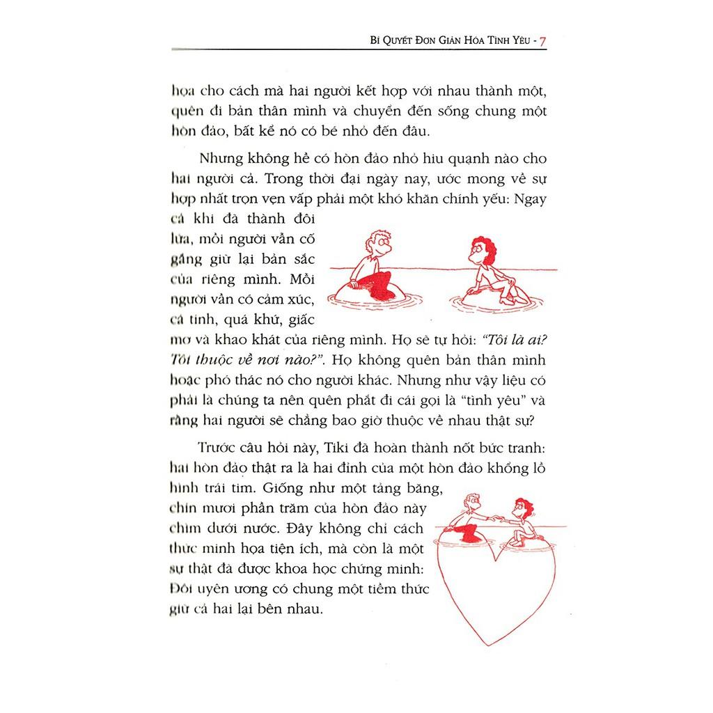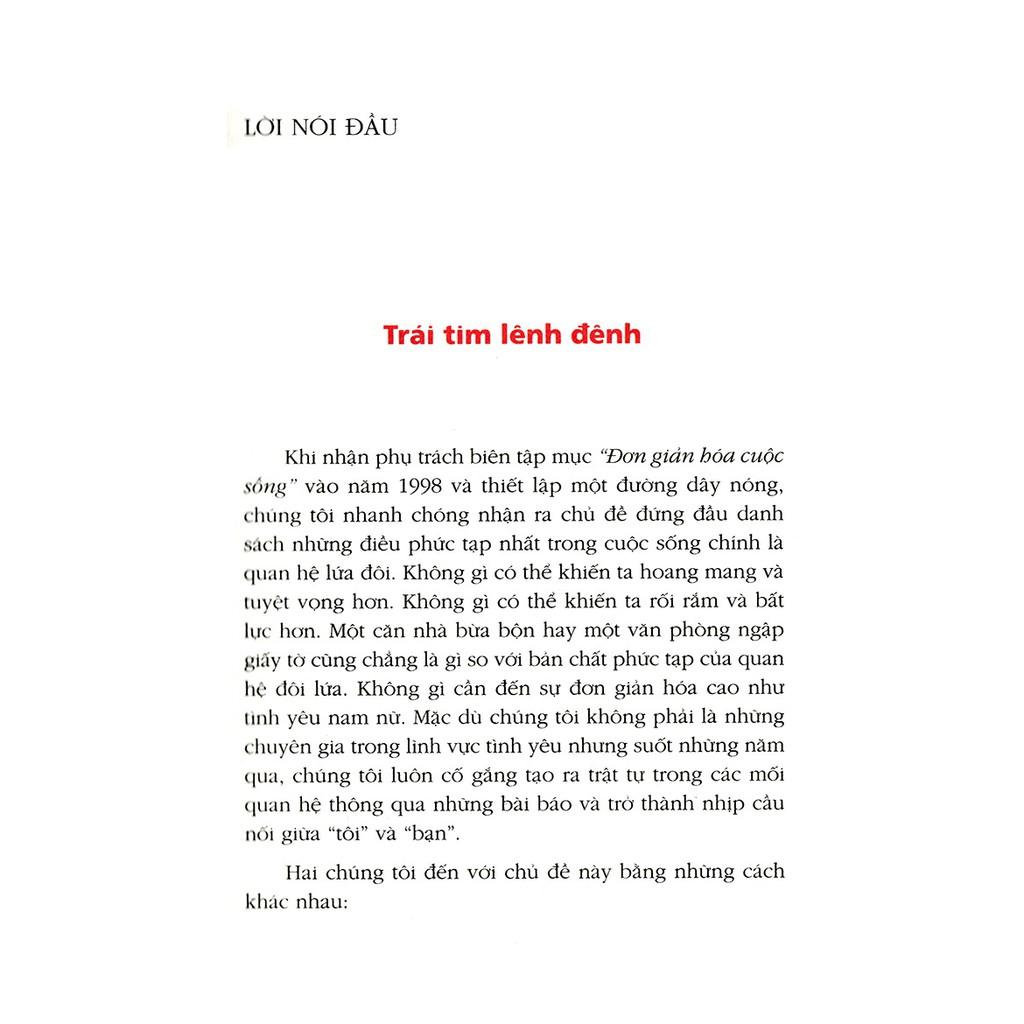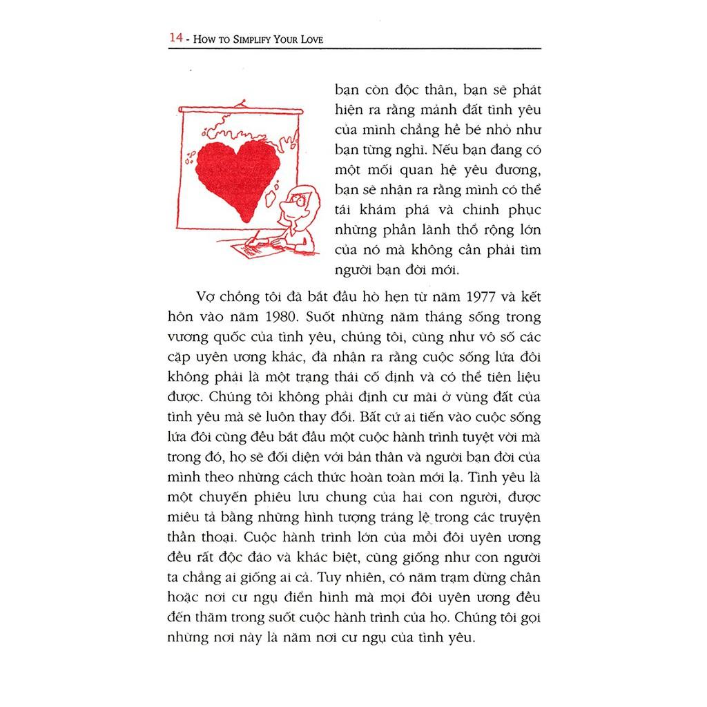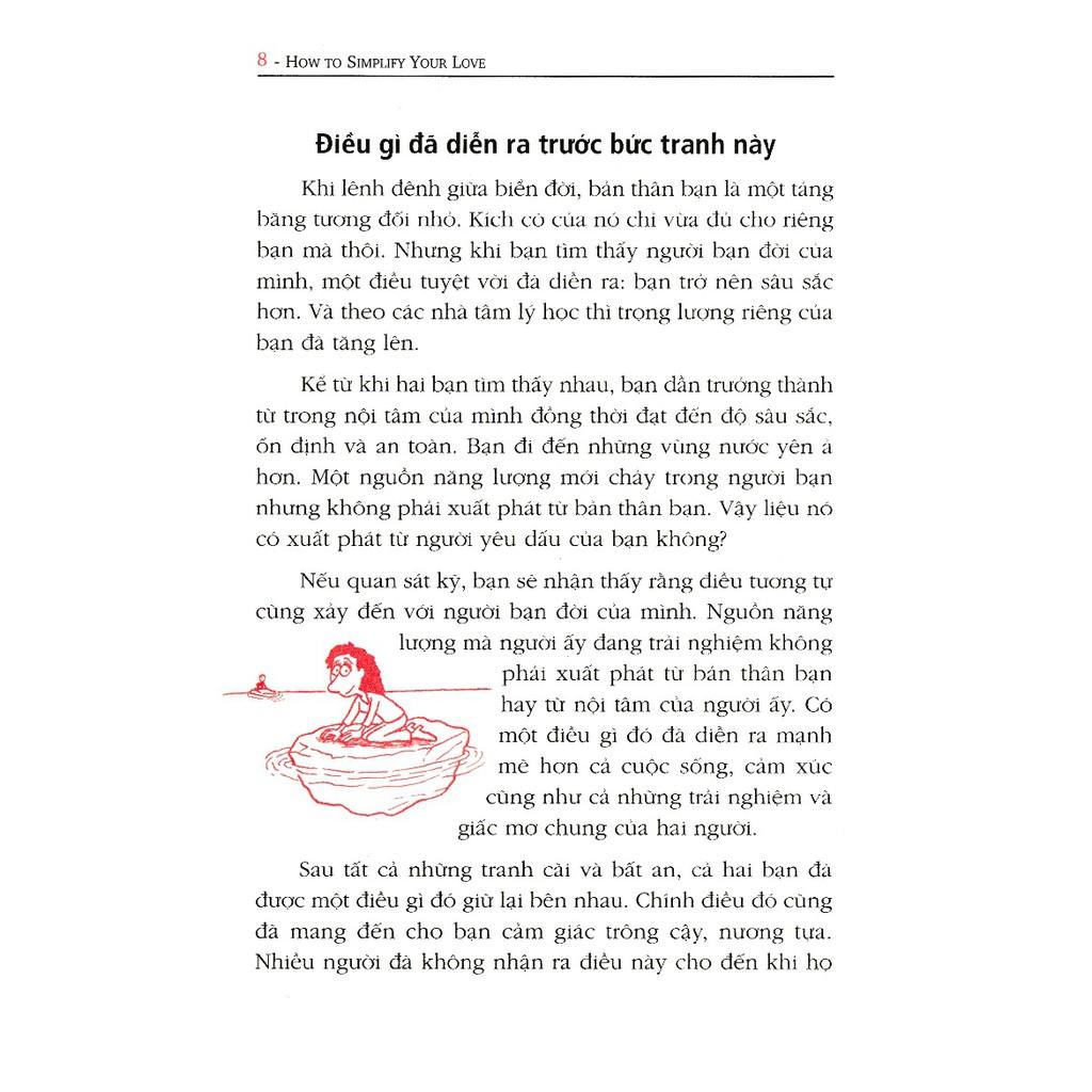 Cuốn sách thú vị này sẽ giúp bạn khai thông những bế tắc trong cuộc sống - những căng thẳng, áp lực cùng những xung đột kéo dài - để bạn có thể tập trung vào mối quan hệ và tình yêu trong tim mình. "Bí quyết đơn giản hóa tình yêu" hướng dẫn bạn qua năm giai đoạn cơ bản của các mối quan hệ yêu đương - năm "nơi cư ngụ" của tình yêu - với những hình minh họa dí dỏm, những câu chuyện ngụ ngôn sâu sắc và các bài học thực tế, hữu ích. Bạn sẽ học được trong cuốn sách này những cách thật đơn giản để: - Nhận biết liệu người bạn đời của mình có đúng là người dành cho bạn hay không. - Thiết lập nền móng cho một mối quan hệ bền vững. - Kiến tạo hạnh phúc thực sự.