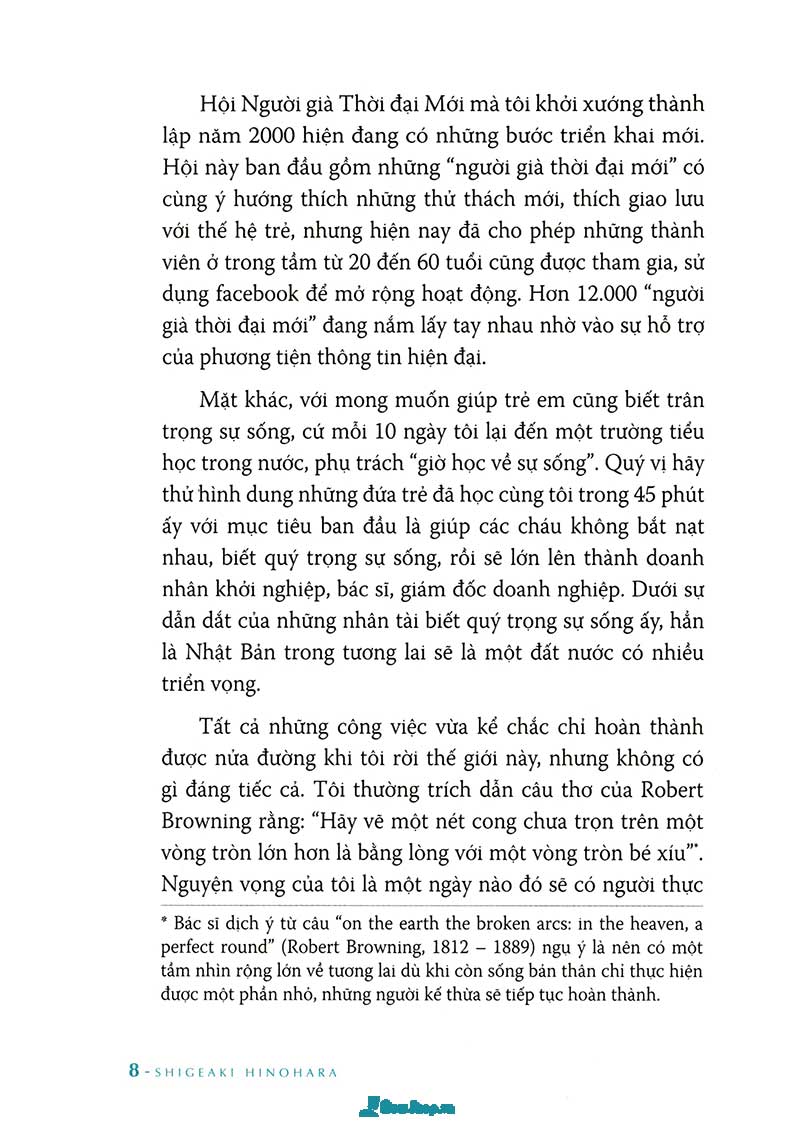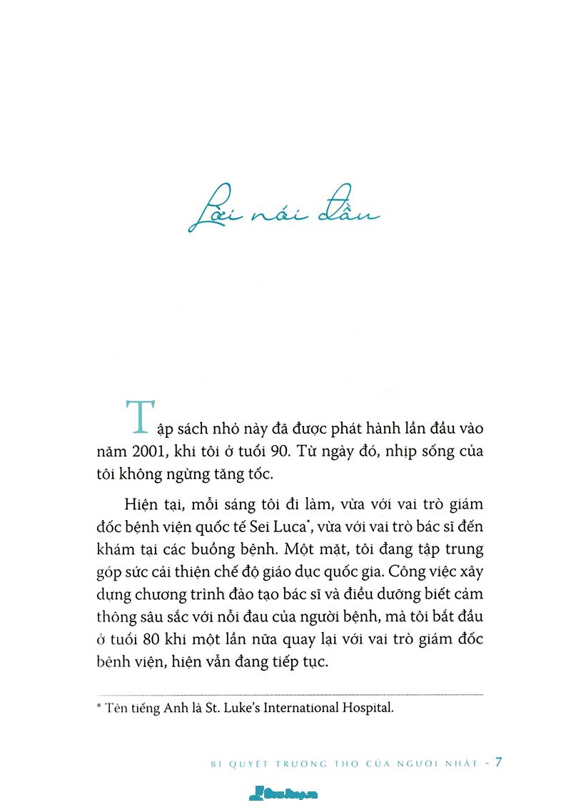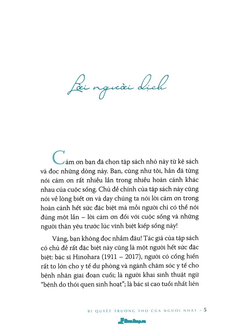 Cố bác sĩ Shigeaki Hinohara sống thọ 106 tuổi và ông vẫn liên tục hành nghề, không nghỉ hưu đến tận ngày 18/7/2016, ngày ông mất. Tựa của quyển sách Bí Quyết Trường Thọ Của Người Nhật có lẽ khiến bạn nghĩ đến việc ông sẽ liệt kê những việc bạn nên làm và không nên làm để có tăng tuổi thọ. Đúng là thế, nhưng quyển sách đặc biệt ở chỗ đó không phải là lý thuyết suông, không phải những lời sáo rỗng mà bạn đôi khi đọc được đâu đó trên mạng, mà đây là những lời khuyên đã được viết bởi một vị bác sĩ già khi bước qua tuổi 90, người đã trải qua những dấu mốc mang tính lịch sử của Nhật Bản và Thế Giới, từng chứng kiến hơn 4000 bệnh nhân giã từ cuộc sống. Đó là tinh hoa từ những kinh nghiệm quý báu khi ông c.hữa ị cho bệnh nhân, khi ông lắng nghe họ và cả từ những sai lầm mà ông đã phạm phải bởi sự hiếu thắng khi còn trẻ của mình.