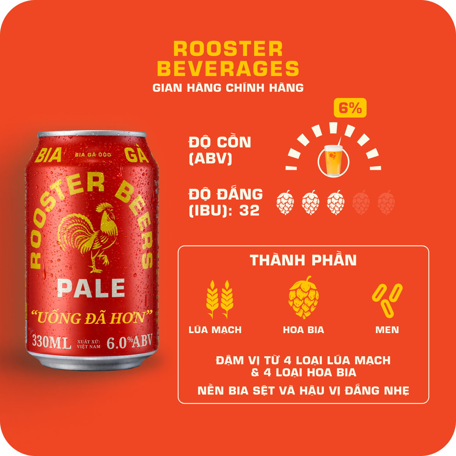 Mua tại TiktokRooster Beers Pale - Vị Nồng Nàn Dễ dành chinh phục cả những người sành bia khó tính Rooster Pale mang đến cho bạn trải nghiệm thưởng bia tinh tế với nền bia sệt quấn quýt nơi đầu lưỡi, hậu vị đắng nhẹ và hương hoa bia nồng nàn. Ghi chú • Bia Pale phong cách Mỹ • Được nấu từ 4 loại lúa mạch và 4 loại hoa bia • Nền bia sệt. Hậu vị đắng nhẹ • 6.0% ABV – 32 IBU • Dùng kèm các món nướng: xúc xích, hải sản và thịt bò. VỀ ROOSTER BEERS: Là những chuyên gia nấu bia đầy đam mê, sáng tạo và nhiệt huyết, chúng tôi mong muốn mang đến cho khách hàng những dòng bia thủ công mang hương vị cổ điển tuyệt hảo. Mỗi ngụm bia Rooster mát lạnh sẽ là một trải nghiệm thuởng thức đáng nhớ, kể cả đối với những người sành bia lâu năm.