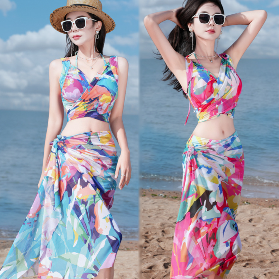 Bikini, đồ bơi nữ đi biển set 3 món hai mảnh họa tiết hoa kèm khăn quấn