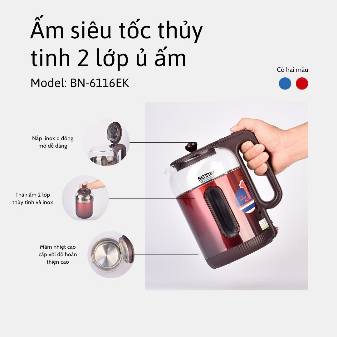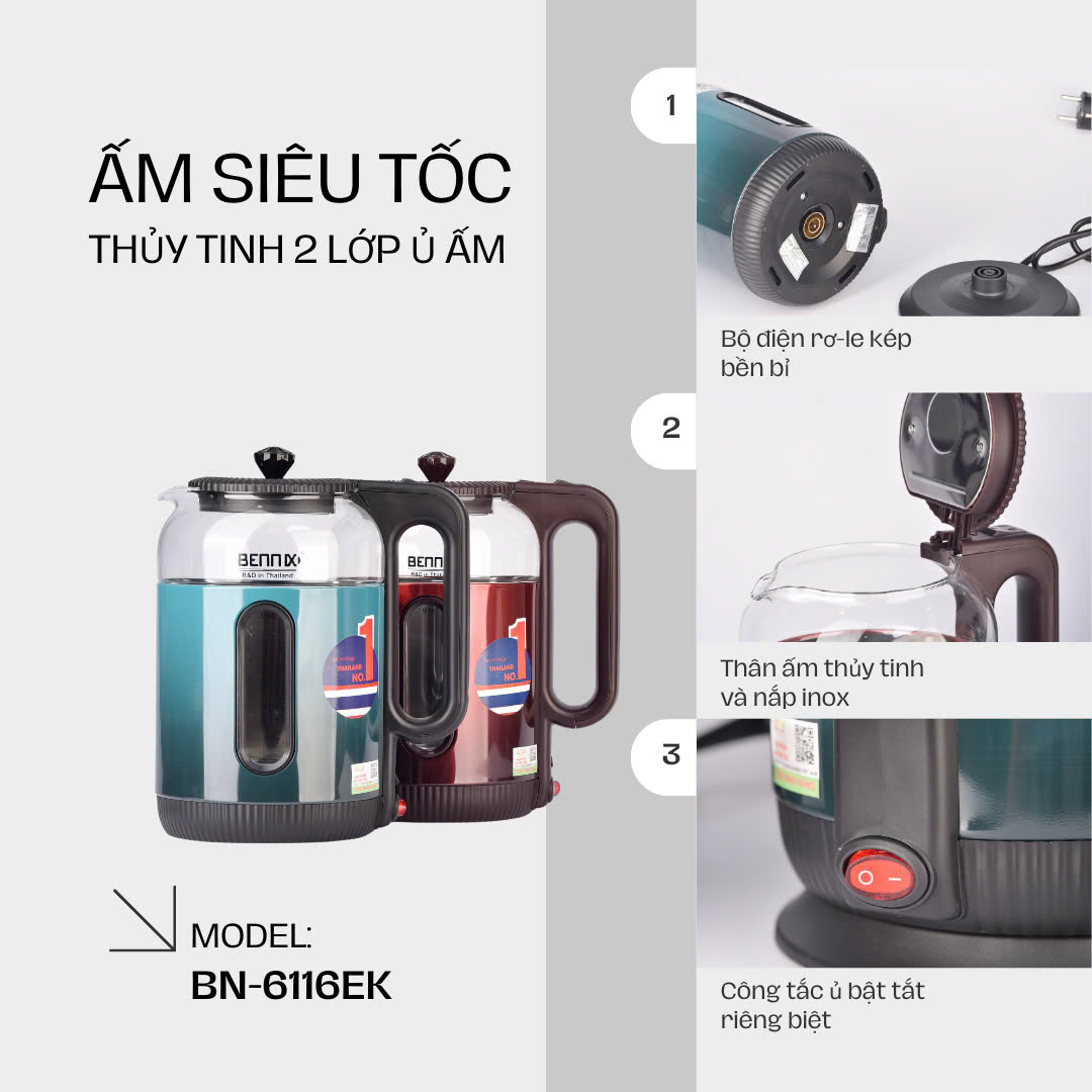✨Bình Đun Siêu Tốc Ủ Ấm 2 Lớp Cách Nhiệt Bằng Thuỷ Tinh Bennix BN-6116EK Dung Tích 2L Công Suất 1500W- Hàng Chính Hãng