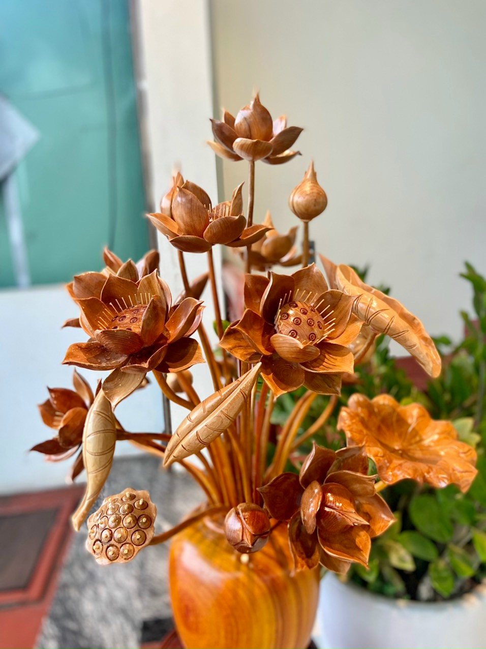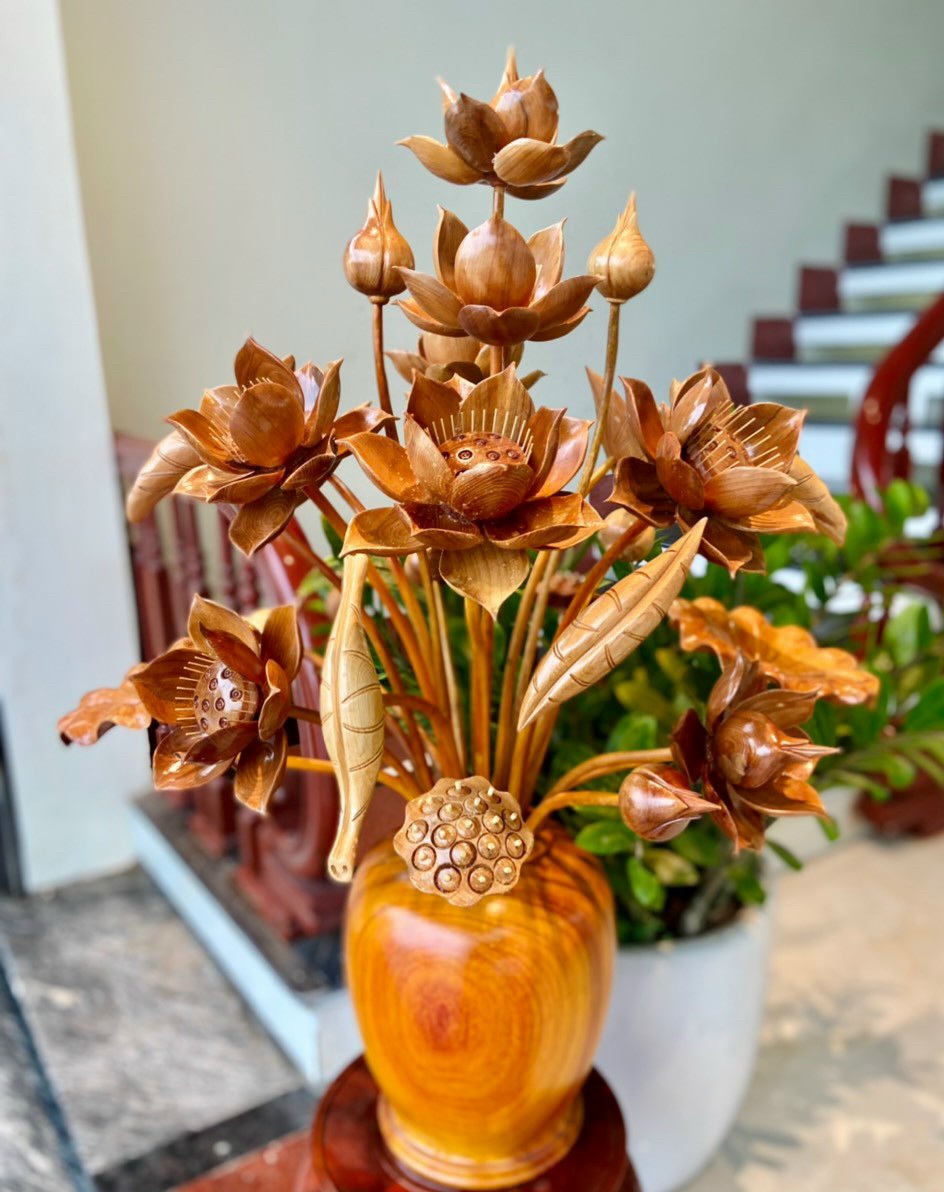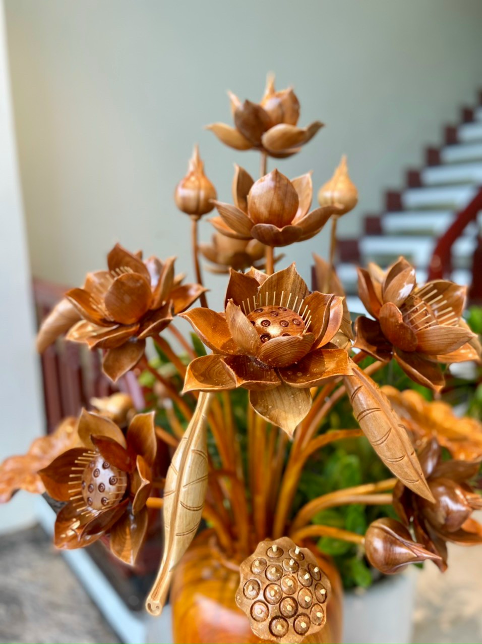 _ 1 bình hoa sen 21 cành trang trí ,phòng khách ,phòng thờ được làm bằng chất liệu gỗ hương đỏ tự nhiên 100% _ Kt bình cắm 23×22cm+ hoa lá gương cao tổng 85cm