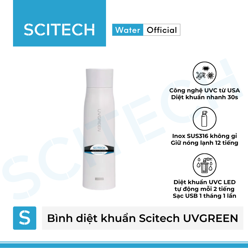 Bình nước giữ nhiệt diệt khuẩn Scitech UVGREEN 500ML là dòng bình nước giữ nhiệt kết hợp lọc diệt khuẩn bằng công nghệ UVC LED từ USA. Nước trong bình luôn đảm bảo sạch khuẩn