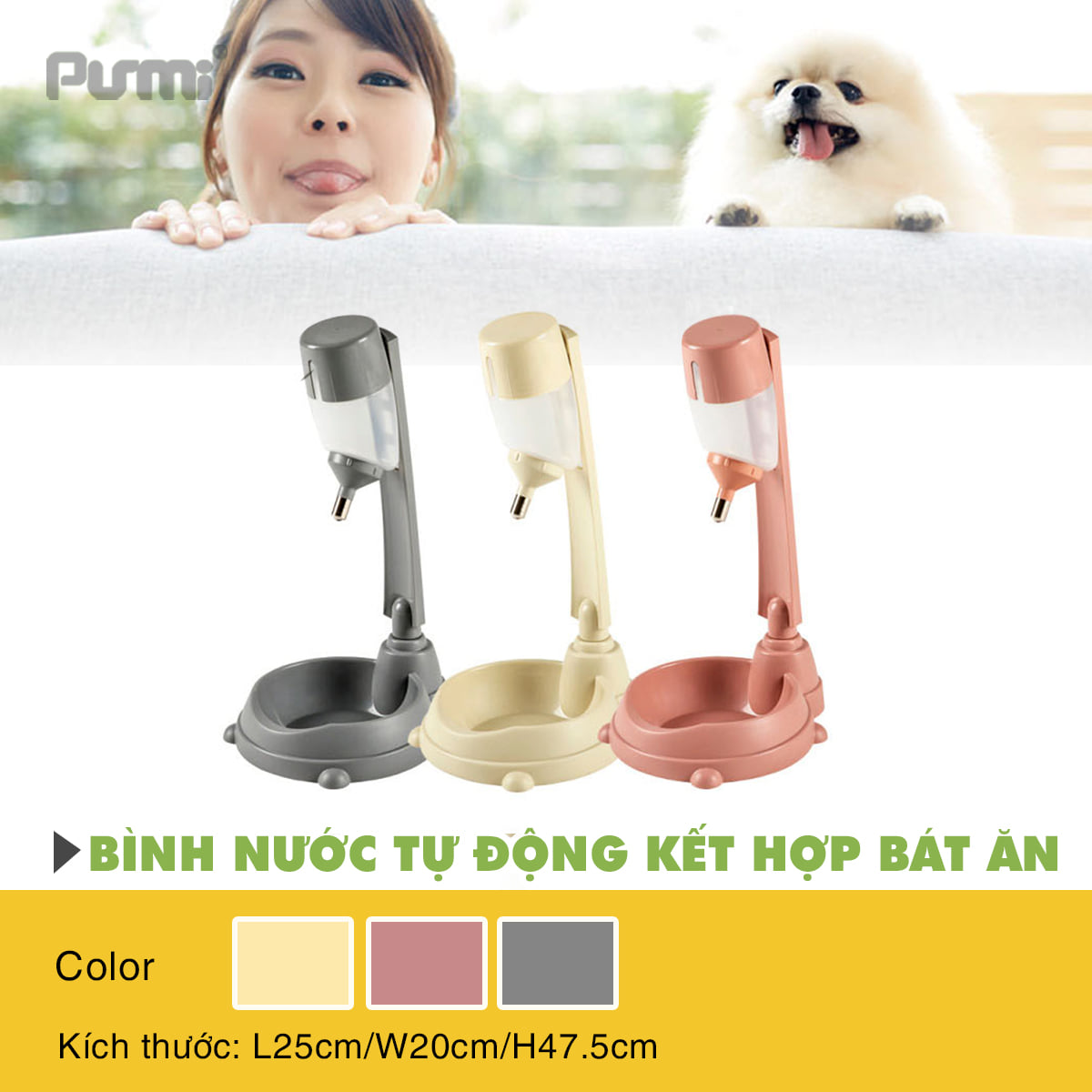 Bình nước kết hợp bát ăn có khấc Purmi có 3 màu: hồng, xám, kem với chất liệu thân thiện với môi trường (chất liệu propylene thường sử dụng trong các sản phẩm đựng đồ