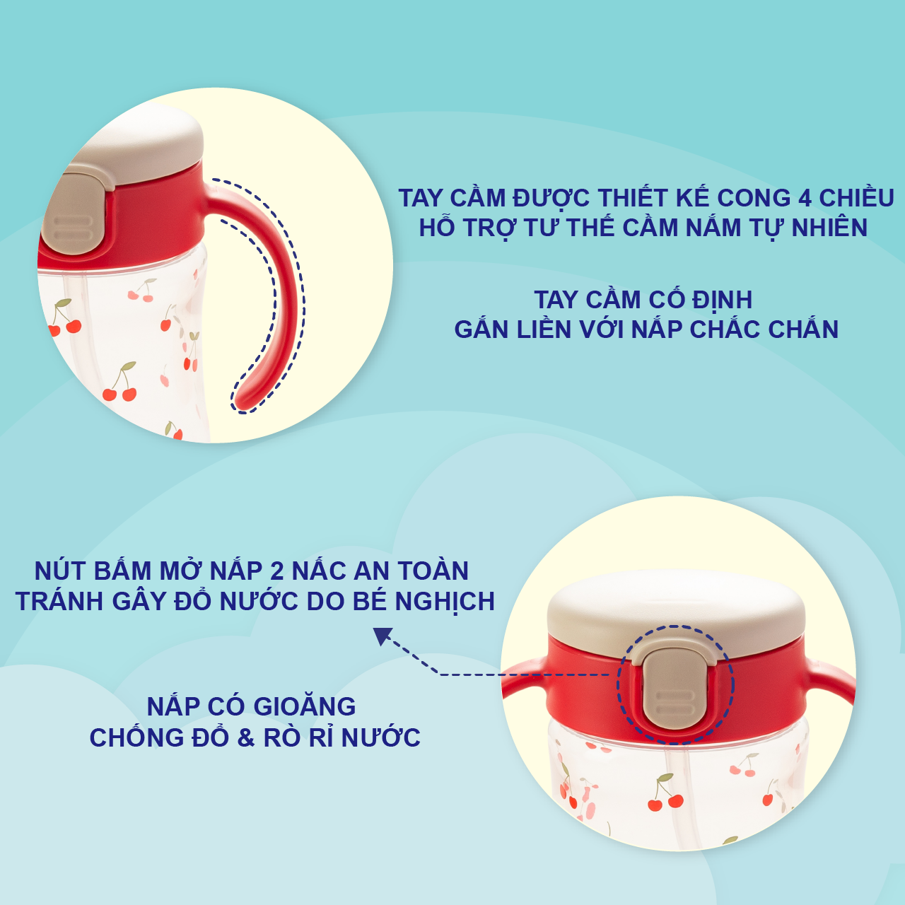 Đặc điểm sản phẩm - Nhựa PP an toàn, không chứa BPA, chịu nhiệt 120 độ C - Thiết kế phù hợp, vừa khuôn miệng - Tay cầm an toàn, chắc chắn - Quy cách: