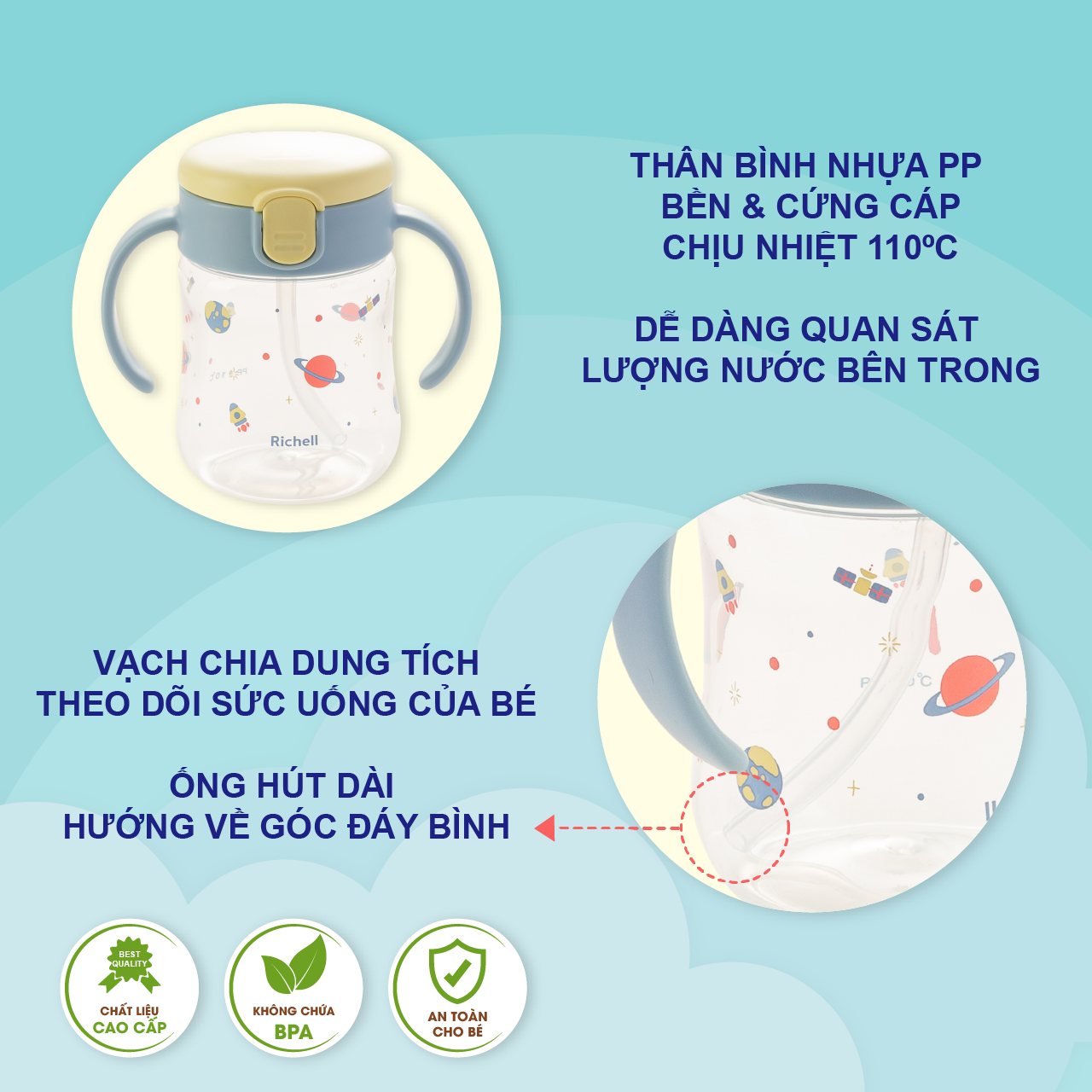 Bình ống hút chống đổ 200ml Richell, cốc ống hút đầu silicone mềm, chống sặc hiệu quả