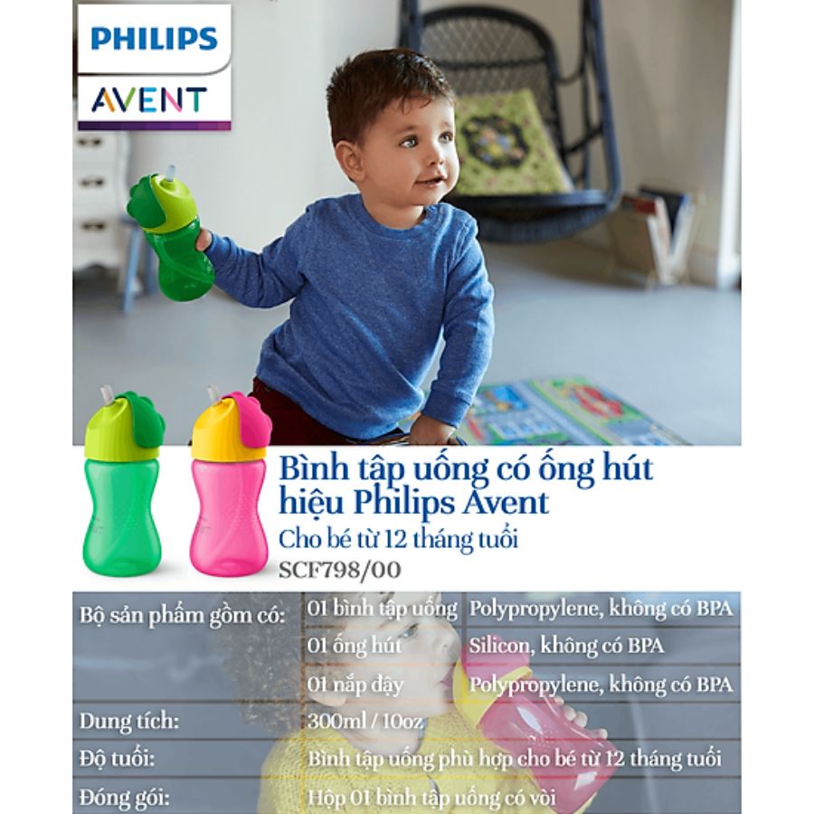 Giới thiệu Philips AventBình tập uống có ống hút 300ml (12m+) SCF798/00 Đặc điểm nổi bật Ống hút uốn cong để bé uống nước đến giọt cuối cùng Phần cuối của ống hút uốn cong để