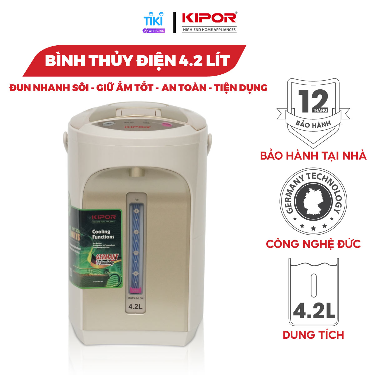 ✨Bình thuỷ điện KIPOR KP-EP642 - 4,2L - Ruột bình inox 304 - Đun sôi nhanh, có tay cầm, chế độ tự bật, tự ngắt, 3 chế độ lấy nước - Hàng chính hãng