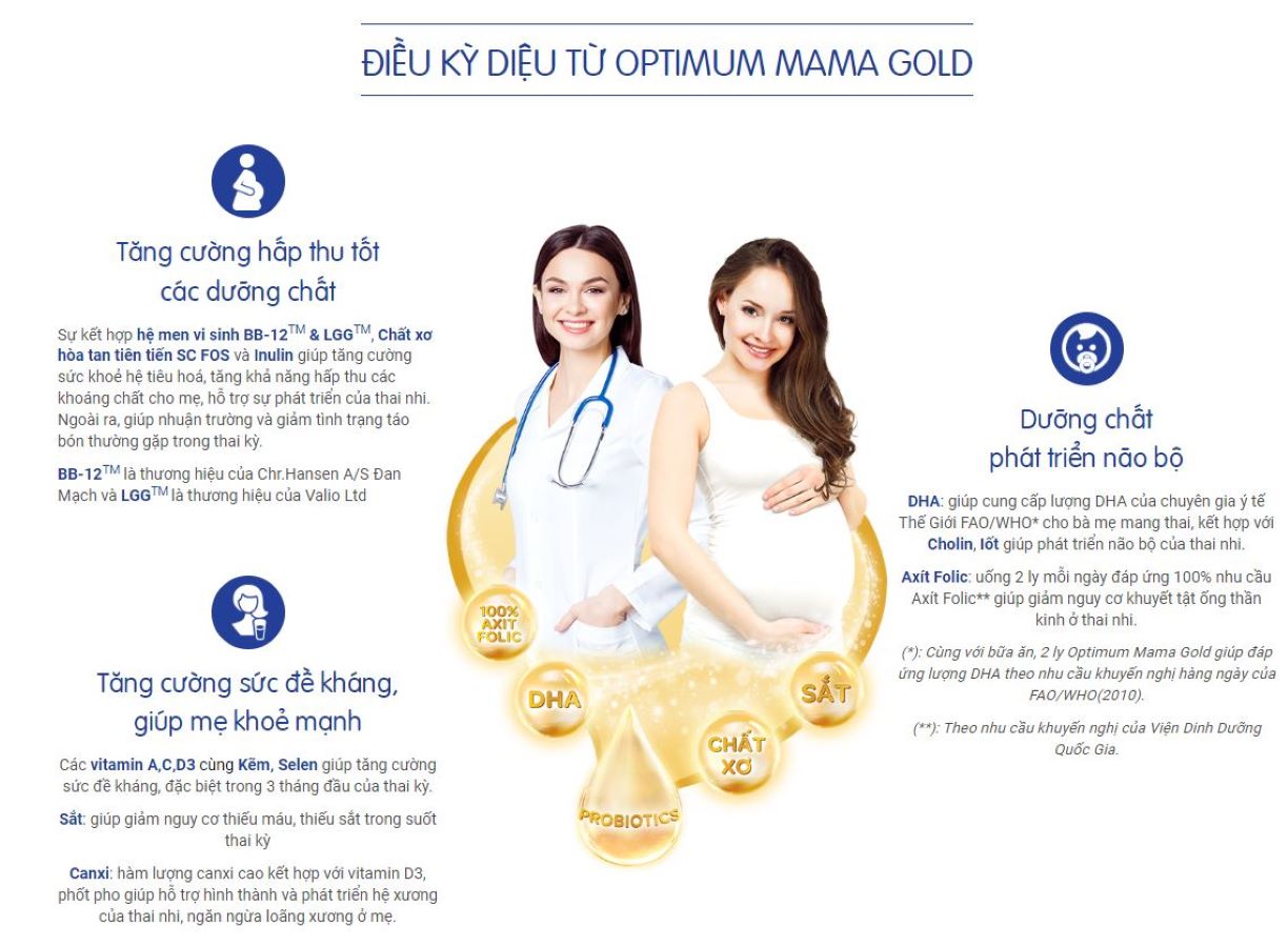 - Sữa cho mẹ và bé Optimum Mama Gold có thể xem là một lựa chọn hợp lý, tốt nhất vì có công thức Opti-Immune giúp tăng cường sức khỏe hệ tiêu hóa & đề kháng cho mẹ, cung cấp đầy đủ các dưỡng chất thiết yếu đáp ứng nhu cầu dinh dưỡng tăng cao trong thời kỳ mang thai và cho con bú; giúp mẹ khoẻ mạnh thoải mái, từ đó tạo nền tảng cho sự phát triển toàn diện của bé. Thành phần Sữa từ 100% sữa tươi (96%), đường (3,8%), chất ổn định (471, 460(i), 407, 466), vitamin (A, D3), khoáng chất (natri selenit/ sodium selenite). Hướng dẫn sử dụng Bước 1: Cho 5 muỗng gạt ngang (khoảng 43 g) Optimum Mama Gold vào 190 ml nước đun sôi để nguội (khoảng 50°C). Bước 2: Khuấy đều cho đến khi bột tan hoàn toàn. Hướng dẫn bảo quản Đậy kín sau mỗi lần sử dụng. Để nơi thoáng mát và khô ráo. Không bảo quản trong tủ lạnh. Sử dụng trong vòng 4 tuần sau khi mở bao bì. Hạn sử dụng xem trên bao bì Quy cách đóng gói có 2 loại