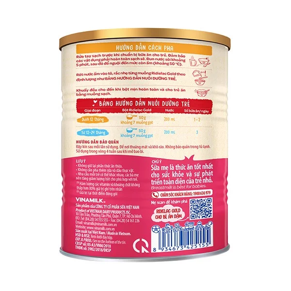 - Sản phẩm này là thức ăn bổ sung và được ăn thêm cùng với sữa mẹ dùng cho trẻ trên 06 tháng tuổi Bột ăn dặm RiDielac Gold dễ tiêu hóa được nghiên cứu bởi các chuyên gia từ Trung tâm nghiên cứu dinh dưỡng và phát triển sản phẩm VINAMILK, đáp ứng nhu cầu dinh dưỡng cho trẻ từ 6 đến 24 tháng tuổi, giúp bổ sung các dưỡng chất, hỗ trợ bé phát triển thể chất trong thời gian ăn dặm. HỖ TRỢ SỨC KHỎE HỆ TIÊU HÓA Bổ sung lợi khuẩn Bifidobacterium, BB-12TM cùng chất xơ hòa tan inulin giúp tăng vi khuẩn có lợi, ức chế vi khuẩn có hại, hỗ trợ tốt sức khỏe hệ tiêu hóa, giúp bé hấp thu nguồn dưỡng chất dồi dào, cho bé phát triển thể chất khỏe mạnh. BB-12 là thương hiệu của Chr. Hansen A/S. HỖ TRỢ DƯỠNG CHẤT CHO BÉ ĂN NGON VÀ KHỎE MẠNH Lysin, vitamin nhóm B và Kẽm giúp bé ăn ngon miệng. Ngoài ra, sản phẩm có chứa 21 vitamin và khoáng chất bao gồm Sắt, Canxi, vitamin D3, C, A, E, giúp bé phát triển cứng cáp hơn. HỖ TRỢ PHÁT TRIỂN NÃO BỘ Axít folic, I ốt, Sắt, Taurin, Axít linoleic, đặc biệt DHA kết hợp với Lutein tạo thành hệ dưỡng chất thiết yếu cho sự phát triển của não bộ, võng mạc mắt, tăng khả năng nhận thức, ghi nhớ và học hỏi của bé. Dành cho trẻ từ 7-24 tháng tuổi. THÔNG SỐ SẢN PHẨM Thành phần trung bình (100g bột) Đơn vị 100g Bột Năng lượng/ Energy Kcal 425.0 Chất đạm/ Protein g 16.0 Chất béo/ Fat g 10.8 Acid linoleic mg 4,200.0 DHA (Docosahexaenoic acid) mg 20.0 Hydrat Cacbon/ Carbohydrate g 65.2 Chất xơ hòa tan/ Soluble fiber g 2.0 Lysin/ Lysine mg 1,000.0 Taurin/ Taurine mg 40.0 Lutein mcg 70.0 Độ ẩm/ Moisture g 2.5 Khoáng chất/ Minerals Natri/ Sodium mg 300.0 Kali/ Potassium mg 550.0 Calci/ Calcium mg 430.0 Phospho/ Phosphorus mg 260.0 Magnesi/ Magnesium mg 33.0 Sắt/ Iron mg 8.0 Iod/ Iodine mcg 80.0 Kẽm/ Zinc mg 3.5 Vitamin/ Vitamins Vitamin A IU 1,600.0 Vitamin D3 IU 260.0 Vitamin E mg 5.0 Vitamin K1 mcg 20.0 Vitamin C mg 52.0 Vitamin B1 mcg 820.0 Vitamin B2 mcg 650.0 Vitamin PP mg 6.7 Vitamin B6 mcg 810.0 Acid folic mcg 82.0 Acid Pantothenic mg 2.5 Vitamin B12 mcg 1.2 Biotin mcg 21.0 MẪU BAO BÌ THAY ĐỔI THEO TỪNG ĐỢT NHẬP HÀNG.