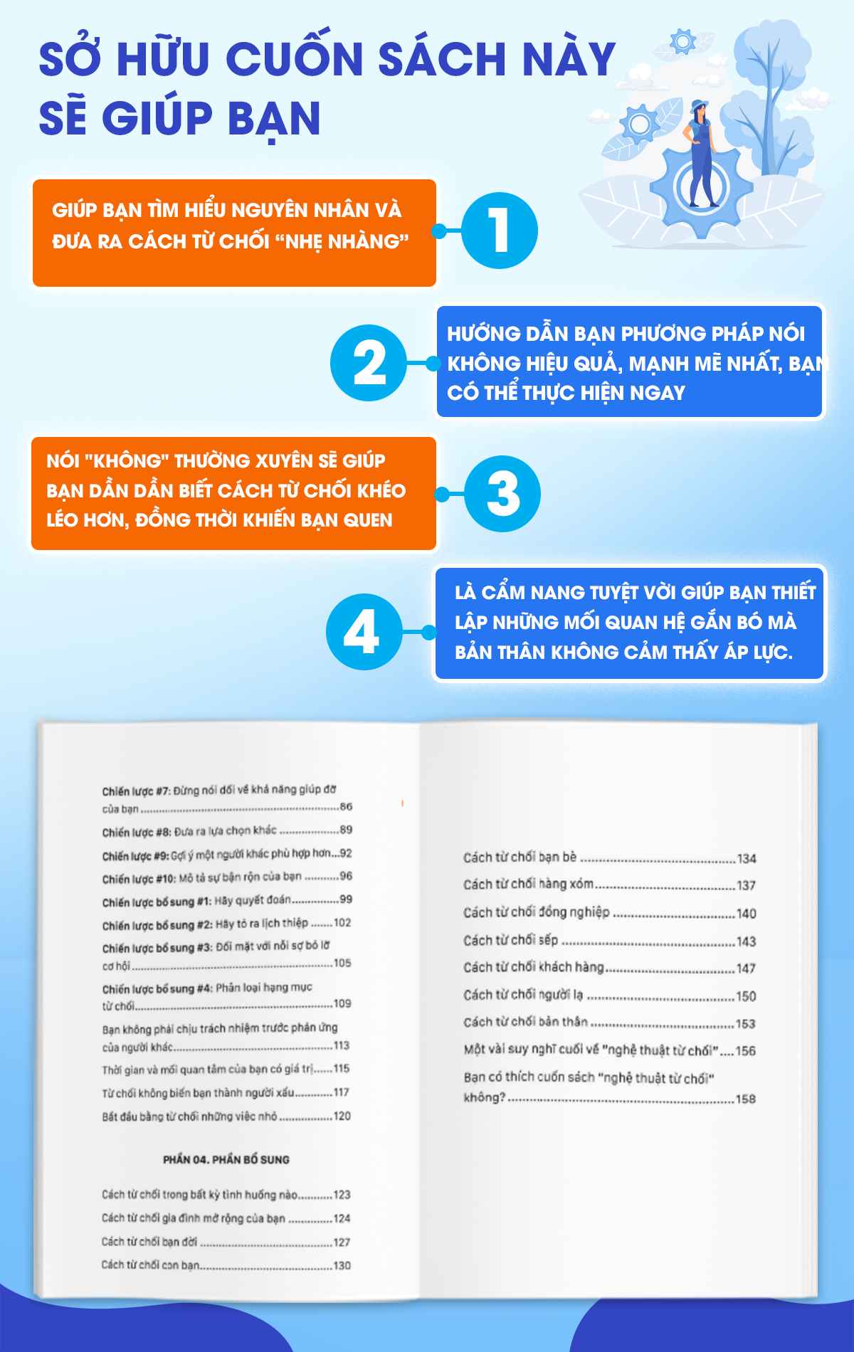 Bí quyết đưa ra lời Từ chối mà không làm tổn hại các mối quan hệ nằm “Nghệ Thuật Từ Chối – Cách Nói Không Mà Vẫn Có Được Đồng Thuận” giúp bạn tìm hiểu nguyên nhân và đưa ra cách từ chối “nhẹ nhàng”. Cuốn sách chia quy trình Từ chối thành những bước như- Chuẩn bị từ chối, đưa ra từ chối và hoàn tất từ chối – cuốn sách hướng dẫn bạn phương pháp nói Không hiệu quả, mạnh mẽ nhất, bạn có thể thực hiện ngay trong đời sống, công việc và các mối quan hệ.
