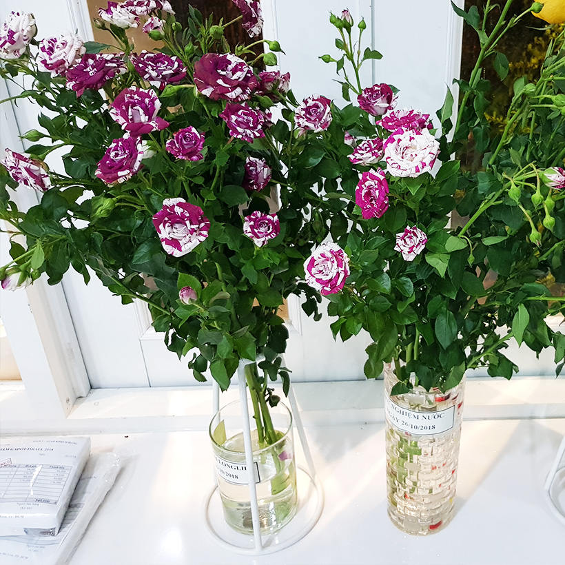 Bình hoa có dùng gói Long Life: Hoa tươi hơn và bung nụ xèo ra rất đều, lá hoa cũng tươi trở lại. Đặc biệt, nước vẫn trong veo