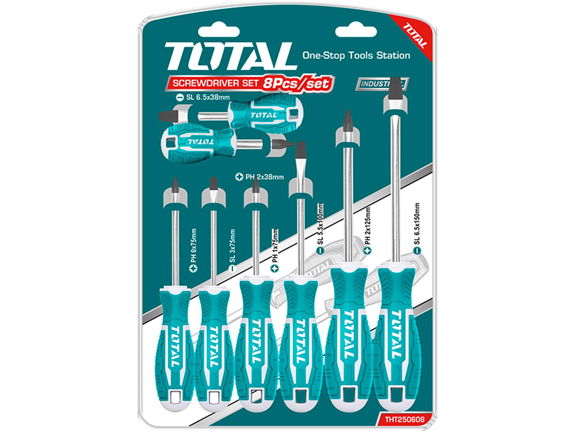 Thông số kĩ thuật -Mã sản phẩm: THT250608 -Nhà sản xuất: Total -Bộ 8 tua vít, kiểu dáng tay cầm tua vít mới, chất liệu CR-V, lưỡi tròn gồm các size: 1pcs SL3.0375 . 1pcs SL5.55100 -1pcs SL6.56150. 1pcs SL6.5638 -1pcs PH0375. 1pcs PH1575. -1pcs PH26125. 1pcs PH2638 - 20/T