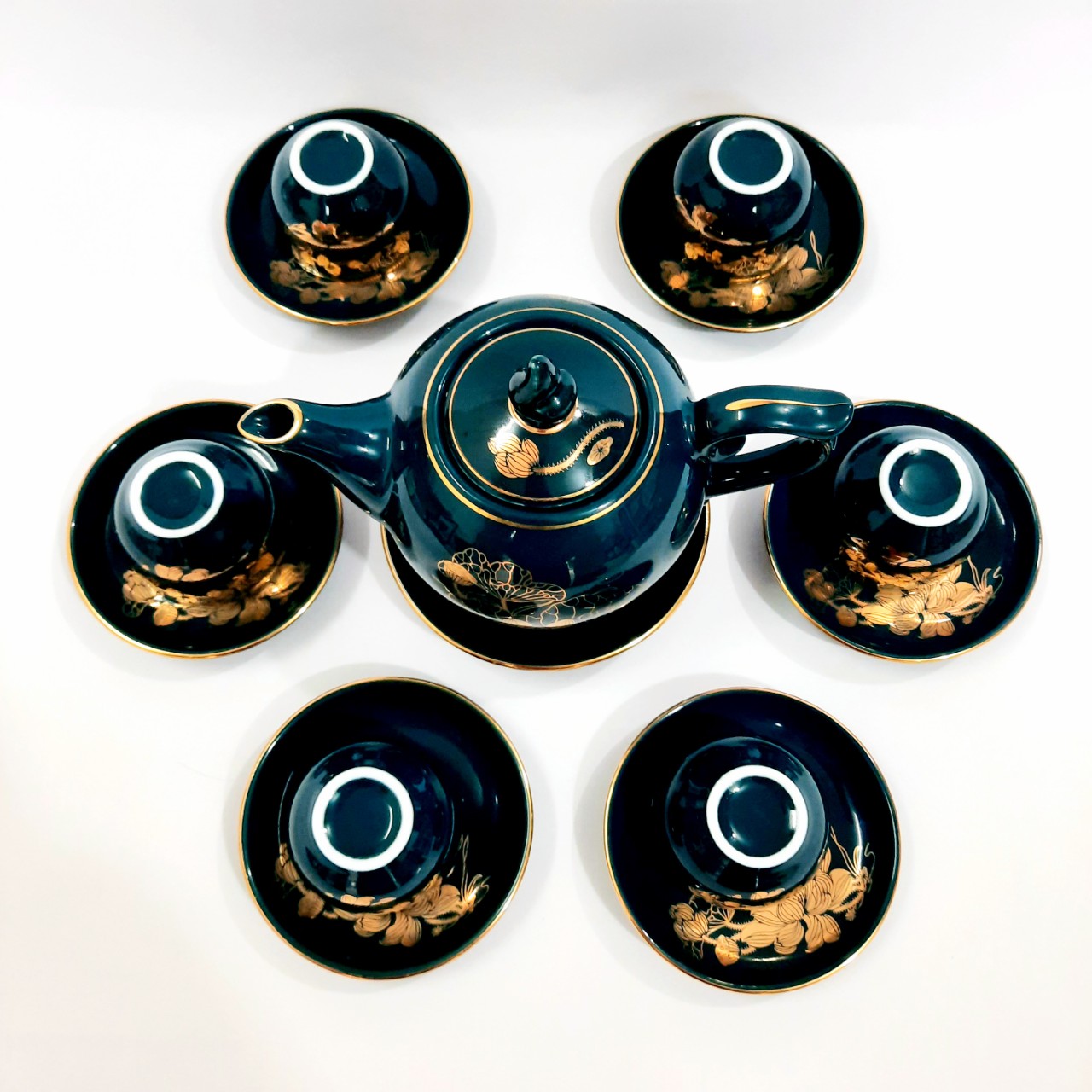 - Bộ sản phẩm bao gồm: 1 ấm trà dung tích 500ml. 6 chén dung 50ml. 1 đĩa kê ấm. 6 đĩa kê chén. Bộ sản phẩm không bao gồm khay. Đặc điểm nổi bật: Bộ ấm chén Bát Tràng cao cấp màu xanh Arctic họa tiết hoa sen vẽ vàng 24k +100% sản phẩm được khử chì, độc tố ở nhiệt độ là 1350d tiêu chuẩn xuất khẩu đã được đăng ký nhãn hiệu độc quyền, đáp ứng yêu cầu khắt khe nhất kể cả thị trường khó tính như Châu Âu.