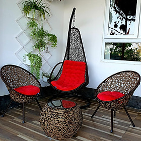 Bộ sản phẩm gồm : 01 bàn mặt kính + 02 ghế + 01 xích đu như hình Đặc biệt kèm theo bộ nệm xích đu + 02 đệm ghế chất liệu vải nhung màu