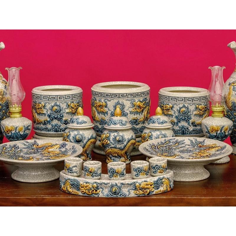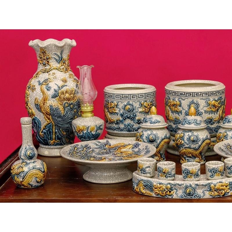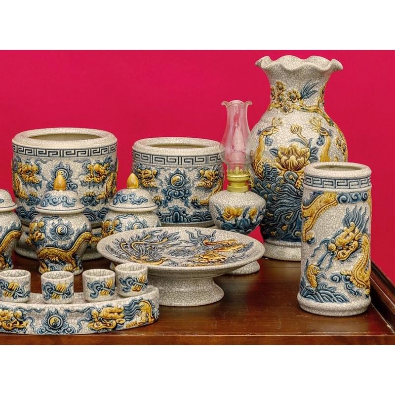 ✨Bộ ban thờ gia tiên men rạn giả cổ, họa tiết đắp nổi thủ công. Gốm sứ Bát Tràng cao cấp.