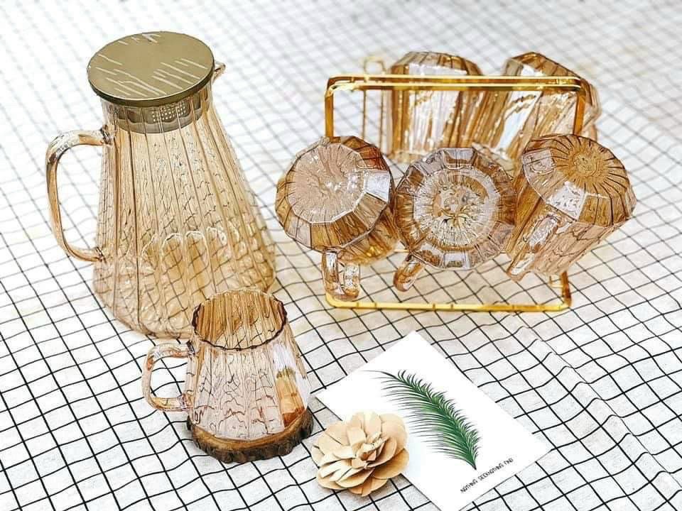 ✨BỘ BÌNH ĐỰNG NƯỚC UỐNG THỦY TINH KÈM 6 CỐC VÀNG SỌC VÀ GIÁ ÚP CỐC - VD106