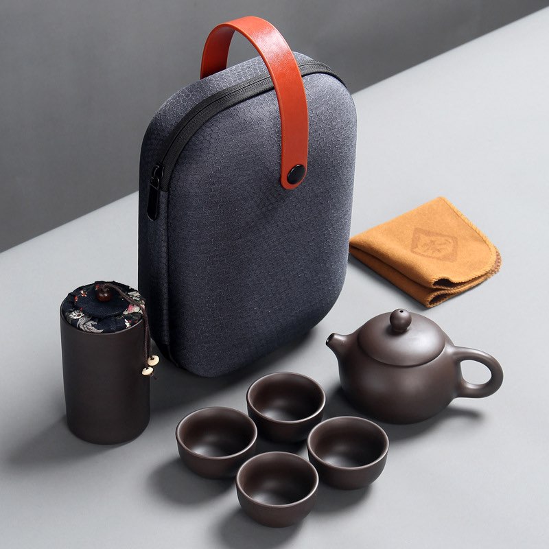 Bộ Ấm Chén Uống Trà Tử Sa Kèm Khay Có Túi Đựng Xách Tay, Đi Du Lịch, Dã Ngoại, Dùng Làm Quà Tặng