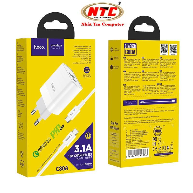 ✨Bộ Cốc sạc 2 cổng USB và PD kèm Cáp sạc Type-C to Type-C dành cho Hoco C80A QC3.0 và PD20W (Trắng) - Hàng Chính Hãng