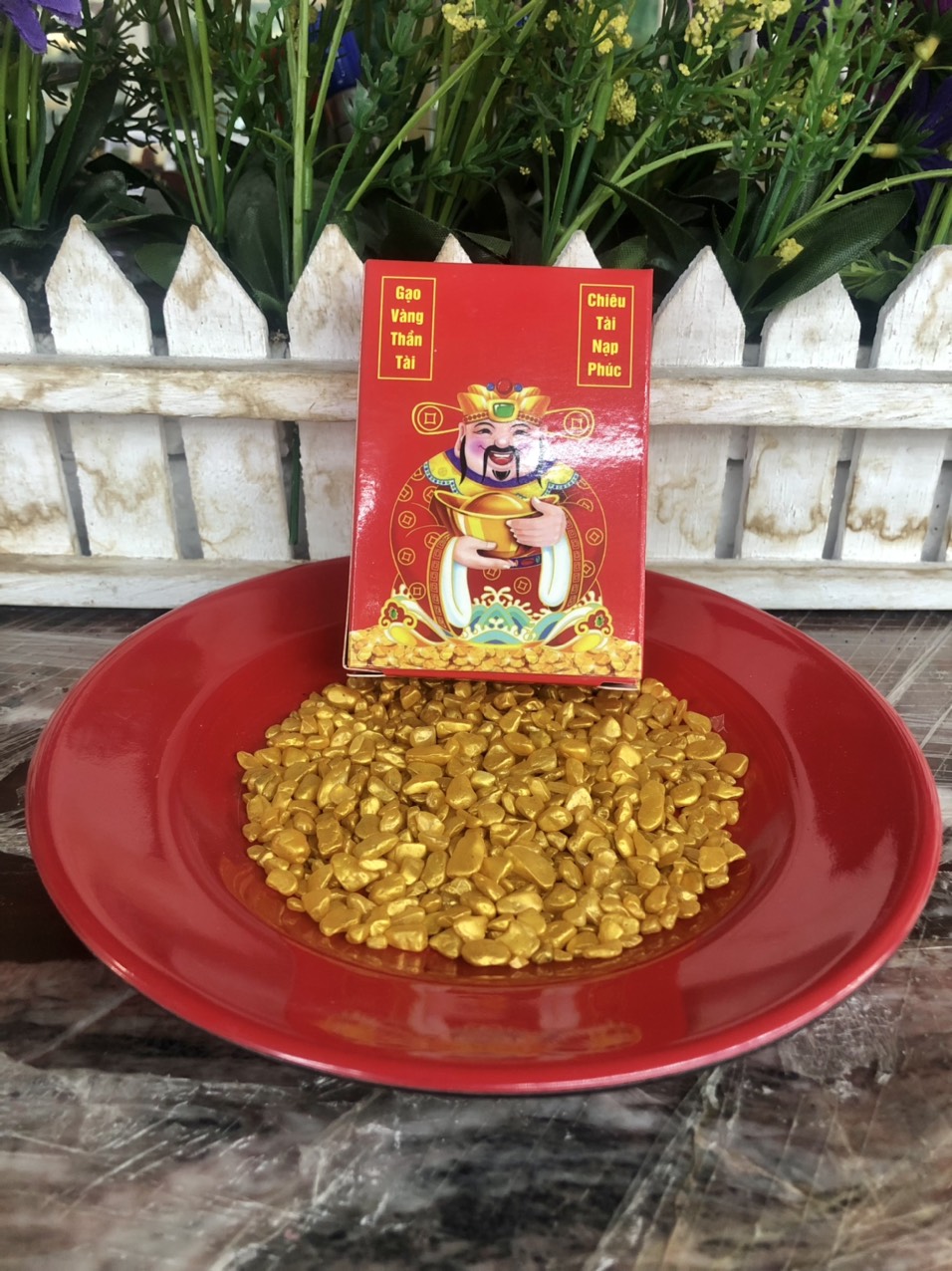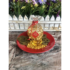 Mua tại TiktokBao gồm: 1 ít gạo vàng thần tài + 1 thỏi vàng thần tài kích lộc + 3 đồng hoa mai + 1 túi tiền lá vàng 14k tài lộc + 9 xu tiền ngũ đế, có đĩa đi kèm.