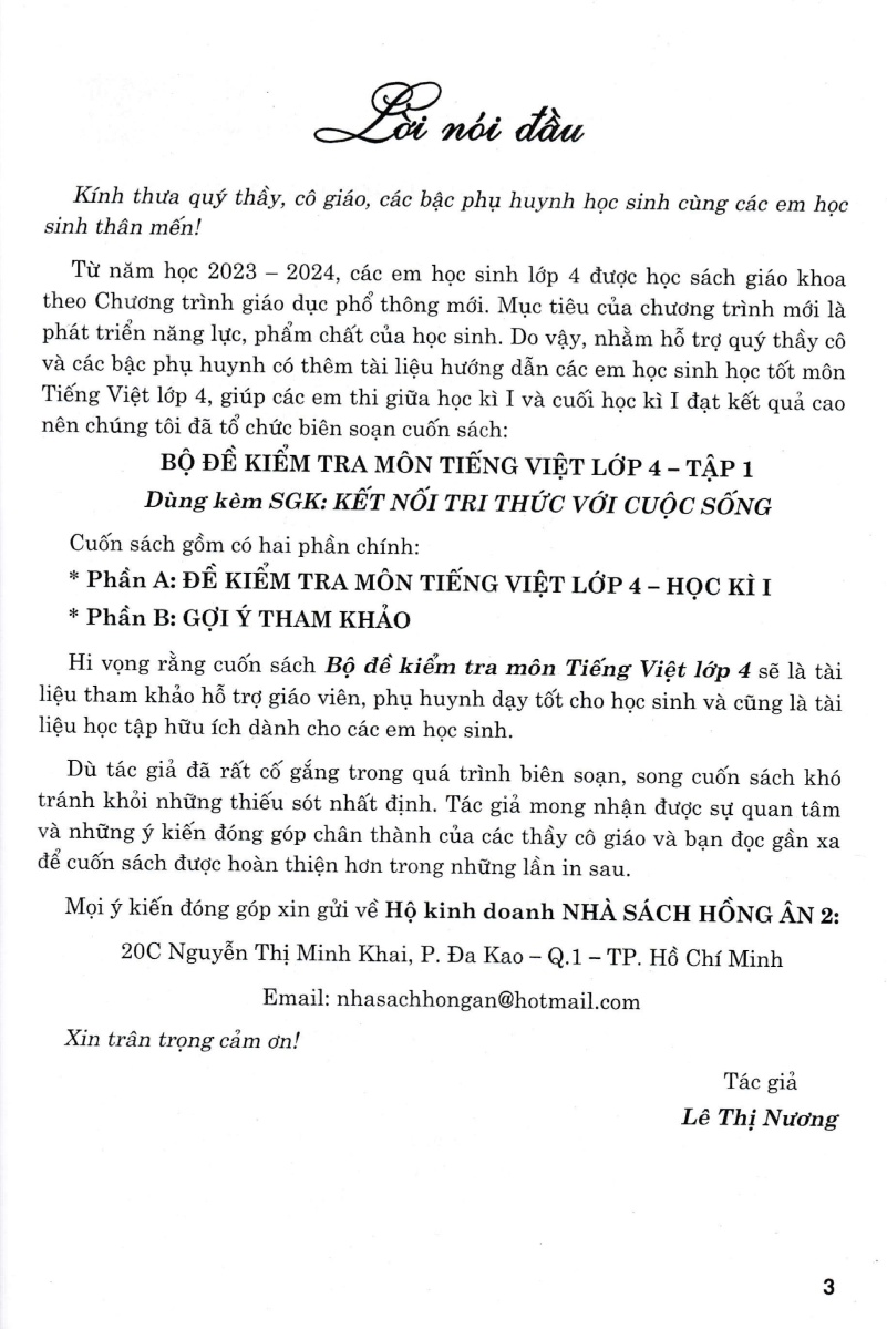 Từ năm học 2023 – 2024, các em học sinh lớp 4 được học sách giáo khoa theo Chương trình giáo dục phổ thông mới. Mục tiêu của chương trình mới là phát triển năng lực, phẩm chất của học sinh. Do vậy, nhằm hỗ trợ quý thầy cô và các bậc phụ huynh có thêm tài liệu hướng dẫn các em học sinh học tốt môn Tiếng Việt lớp 4, giúp các em thi giữa học kì I và cuối học kì I đạt kết quả cao nên chúng tôi đã tổ chức biên soạn cuốn sách: