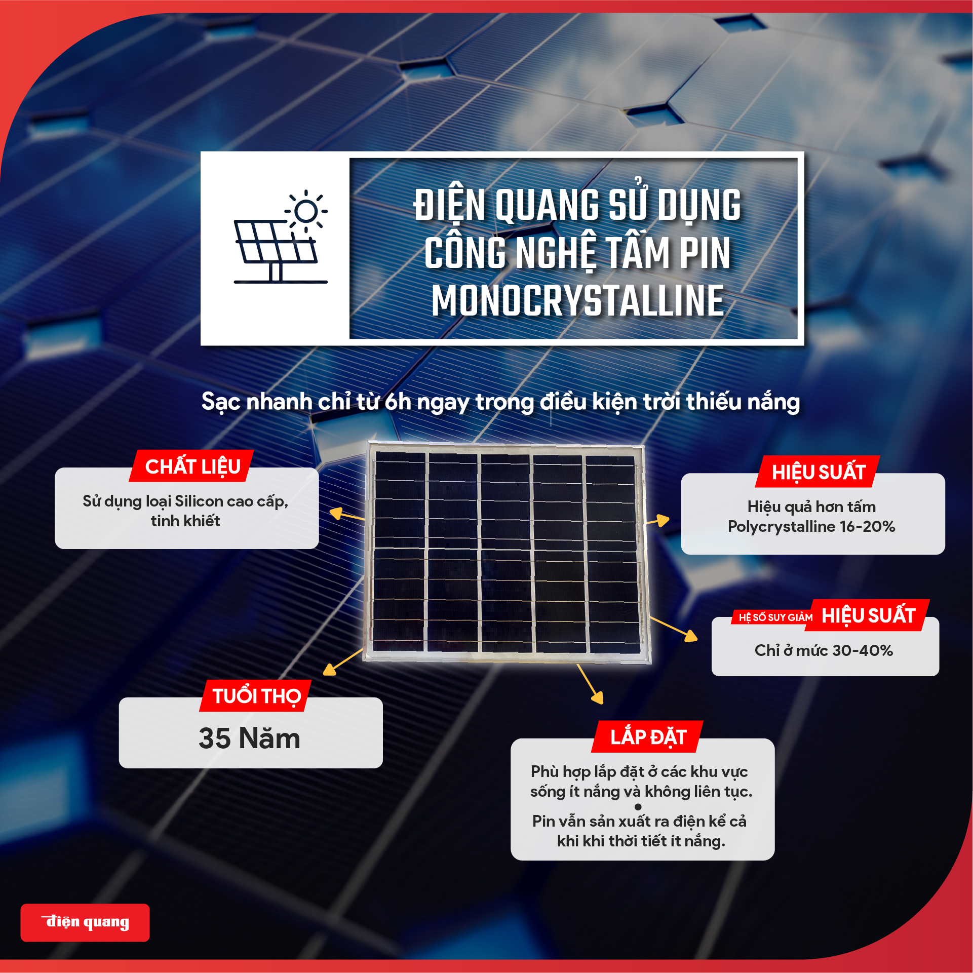 - Đèn pha năng lượng mặt trời Điện Quang sử dụng chip led SMD cho hiệu suất sáng cao và phản ánh màu sắc chân thực, tiết kiệm chi phí tổng thể trong thời gian dài và khả năng chiếu sáng hiệu quả, cực kì tiện ích đối với khu vực không có nguồn điện, giảm nguy cơ bị tai nạn do điện gây ra, kết hợp công nghệ chống thấm IP65 đảm bảo hoạt động tốt trong điều kiện thời tiết mưa kéo dài là sự lựa chọn tốt cho: + Chiếu sáng sân vận động, sân thể thao, .