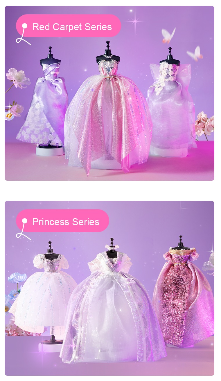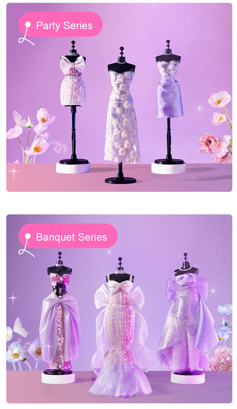 - Ruy băng - viền ren các lại Với hướng dẫn rất cụ thể, chi tiết trong bộ sản phẩm, bé có thể thực hành làm một chiếc váy đuôi cá cực xinh luôn cả nhà ạ Bước 1: Đặt vải ôm sát thân ma nơ canh. Nhét phần vải dư vào giữa lưng ma nơ canh Bước 2: Tiếp tục sử dụng vải tuyn hồng làm lớp váy lót và nhét phần vải dư vào giữa lưng ma nơ canh Bước 3: Thiết kế nơ bằng vải ruy băng và sticker kim cương. Dán nơ phần trước ngực bằng chấm keo Bước 4: Tiếp tục thiết kế phụ kiện như vòng cổ, thắt lưng bằng sticker kim cương hoặc các phụ kiện khác theo sự sáng tạo của bé. Khi bé hoàn thành các thiết kế, bố mẹ đừng ngại ngần trao giải nhà thiết kế cao cấp cho bé thêm yêu thích Trong bộ đồ chơi còn có sẵn 1 showroom trưng bày nho nhỏ - mang đến ngạc nhiên cho bé - bé thật sự nhập vai với việc mình được trở thành 1 nhà thiết kế thời trang chuyên nghiệp - khơi gợi đam mê và thành công cho bé sau này