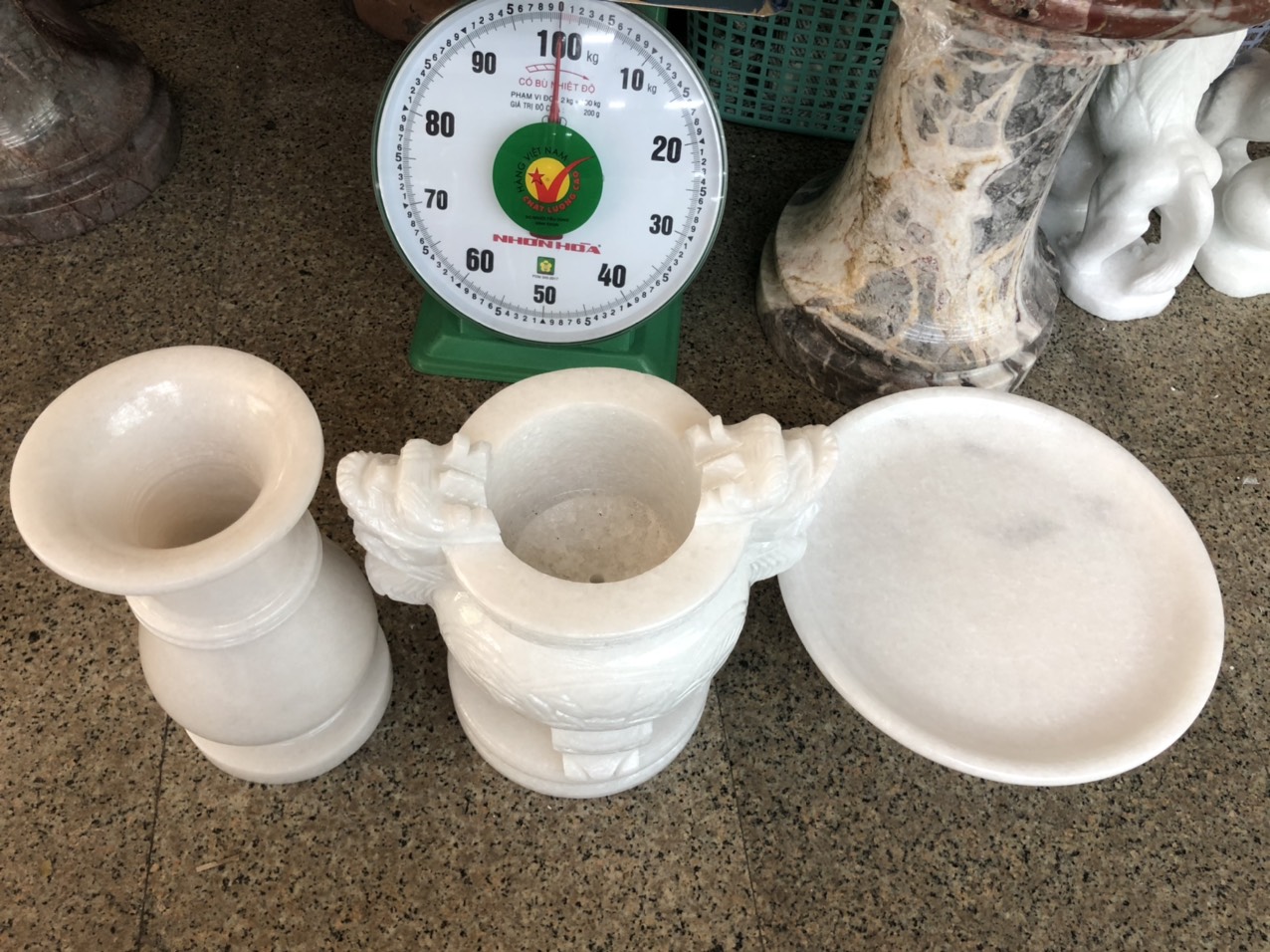 Chất liệu: Đá cẩm thạch trắng Bao gồm: - 1 bình hoa ( Cao 25 cm, Đường kính 11 cm ) - 1 dĩa đựng trái cây ( Đường kính 25cm; Cao 10cm ) -