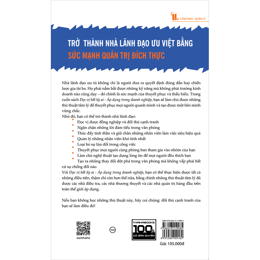 Trong Đọc vị bất kì ai - để không bị lừa dối và lợi dụng, với đầy ắp những thủ thuật tâm lý được trình bày tỉ mỉ mà bạn có thể áp dụng với bất cứ ai hay bất kì tình huống nào, Tiến sĩ David Lieberman trao cho bạn khả năng giành được những gì bạn muốn bất cứ khi nào bạn cần. Không chỉ là các chiến lược hay nguyên tắc, trong cuốn sách này còn có rất nhiều giải pháp cho những vấn đề kinh doanh của bạn. Và bạn sẽ được trang bị những công cụ tối ưu để điều hành doanh nghiệp của mình.